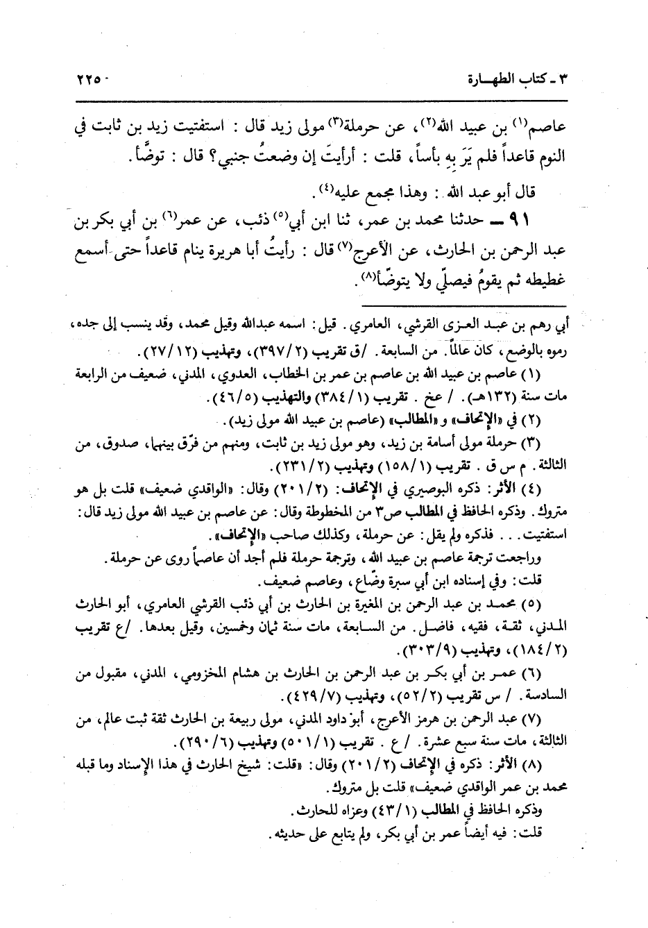 91 - حَدَّثَنَا مُحَمَّدُ بْنُ عُمَرَ، ثنا ابْنُ أَبِي ذِئْبٍ، عَنْ عُمَرَ بْنِ أَبِي بَكْرِ بْنِ عَبْدِ الرَّحْمَنِ بْنِ الْحَارِثِ، عَنِ الْأَعْرَجِ، قَالَ: رَأَيْتُ أَبَا هُرَيْرَةَ «§يَنَامُ قَاعِدًا حَتَّى أَسْمَعَ غَطِيطَهُ ثُمَّ يَقُومُ فَيُصَلِّي وَلَا يَتَوَضَّأُ»
