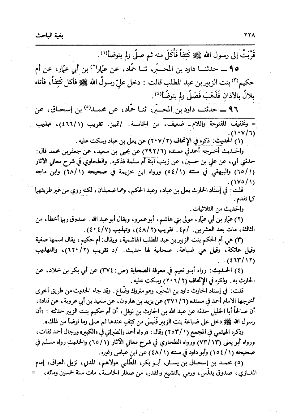 95 - حَدَّثَنَا دَاوُدُ بْنُ الْمُحَبَّرِ، ثنا حَمَّادٌ، عَنْ عَمَّارِ بْنِ أَبِي عَمَّارٍ، عَنْ أُمِّ حَكِيمٍ بِنْتِ الزُّبَيْرِ بْنِ عَبْدِ الْمُطَّلِبِ قَالَتْ: دَخَلَ عَلَيَّ رَسُولُ اللَّهِ صَلَّى اللهُ عَلَيْهِ وَسَلَّمَ «§فَأَكَلَ كَتِفًا فَأَتَاهُ بِلَالٌ بِالْأَذَانِ فَذَهَبَ فَصَلَّى وَلَمْ يَتَوَضَّأْ»