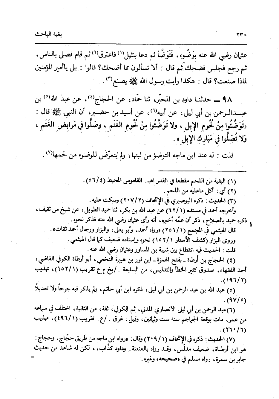 98 - حَدَّثَنَا دَاوُدُ بْنُ الْمُحَبَّرِ، ثنا حَمَّادٌ، عَنِ الْحَجَّاجِ، عَنْ عَبْدِ اللَّهِ بْنِ عَبْدِ الرَّحْمَنِ بْنِ أَبِي لَيْلَى، عَنْ أَبِيهِ، عَنْ أُسَيْدِ بْنِ حُضَيْرٍ أَنَّ النَّبِيَّ صَلَّى اللهُ عَلَيْهِ وَسَلَّمَ قَالَ: «§تَوَضَّئُوا مِنْ لُحُومِ الْإِبِلِ وَلَا تَتَوَضَّئُوا مِنْ لُحُومِ الْغَنَمِ , وَصَلُّوا فِي مَرَابِضِ الْغَنَمِ وَلَا تُصَلُّوا فِي مَبَارِكِ الْإِبِلِ» , قُلْتُ لَهُ عِنْدَ ابْنِ مَاجَهْ التَّوَضُّؤُ مِنْ لَبَنِهَا وَلَمْ يَتَعَرَّضْ لِلْوُضُوءِ مِنْ لَحْمِهَا