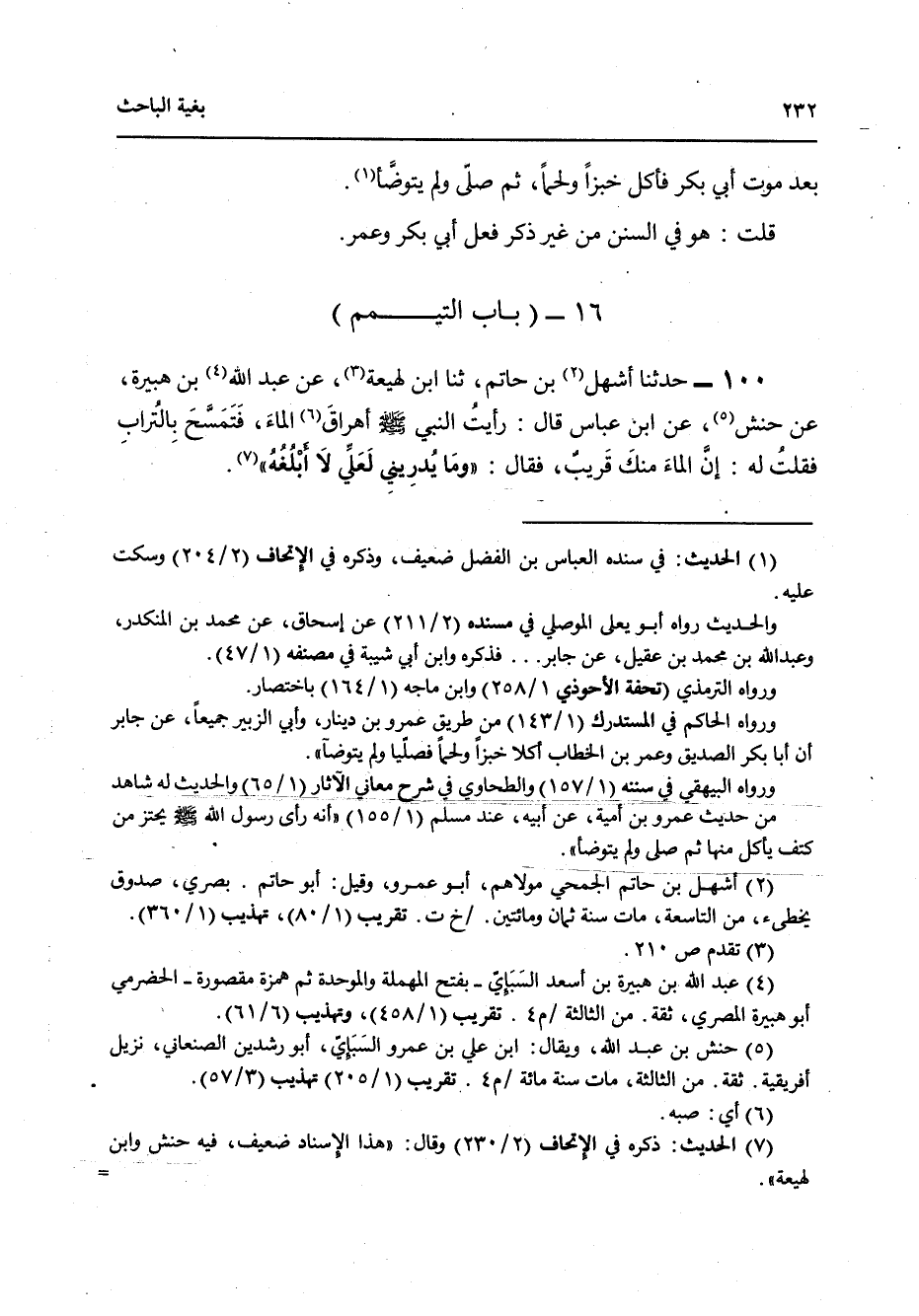 100 - حَدَّثَنَا أَشْهَلُ بْنُ حَاتِمٍ، ثنا ابْنُ لَهِيعَةَ، عَنْ عَبْدِ اللَّهِ بْنِ هُبَيْرَةَ، عَنْ حَنَشٍ، عَنِ ابْنِ عَبَّاسٍ قَالَ: رَأَيْتُ النَّبِيَّ صَلَّى اللهُ عَلَيْهِ وَسَلَّمَ " §أَهْرَاقَ الْمَاءَ فَتَمَسَّحَ بِالتُّرَابِ فَقُلْتُ لَهُ: إِنَّ الْمَاءَ مِنْكَ قَرِيبٌ فَقَالَ: وَمَا يُدْرِينِي لَعَلِّي لَا أَبْلُغُهُ "