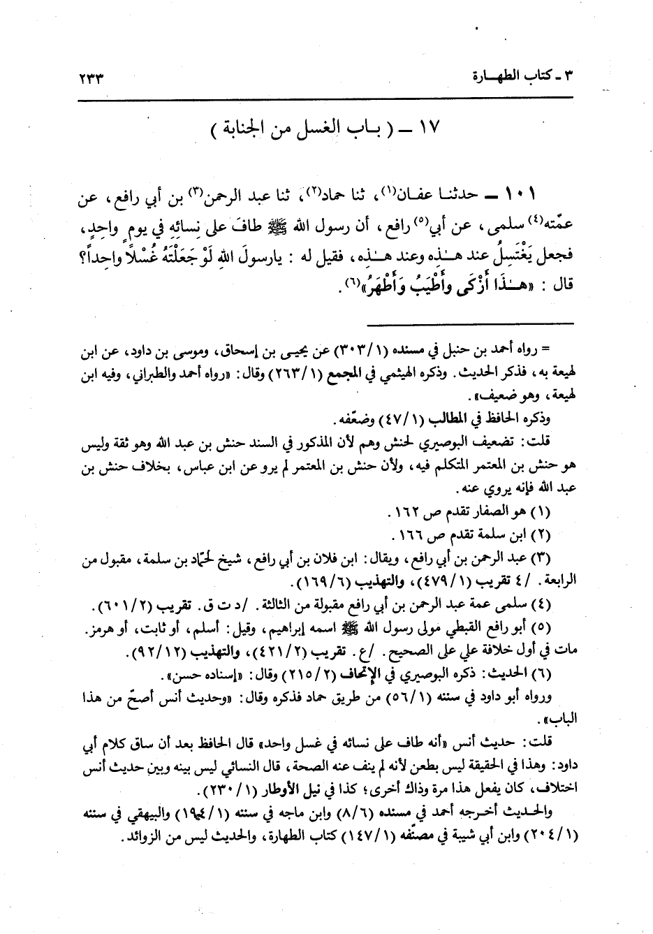101 - حَدَّثَنَا عَفَّانُ، ثنا حَمَّادٌ، ثنا عَبْدُ الرَّحْمَنِ بْنُ أَبِي رَافِعٍ، عَنْ عَمَّتِهِ سَلْمَى، عَنْ أَبِي رَافِعٍ أَنَّ رَسُولَ اللَّهِ صَلَّى اللهُ عَلَيْهِ وَسَلَّمَ " §طَافَ عَلَى نِسَائِهِ فِي يَوْمٍ وَاحِدٍ فَجَعَلَ يَغْتَسِلُ عِنْدَ هَذِهِ وَعِنْدَ هَذِهِ فَقِيلَ لَهُ: يَا رَسُولَ اللَّهِ لَوْ جَعَلْتَهُ غُسْلًا وَاحِدًا قَالَ: هَذَا أَزْكَى وَأَطْيَبُ وَأَطْهَرُ "