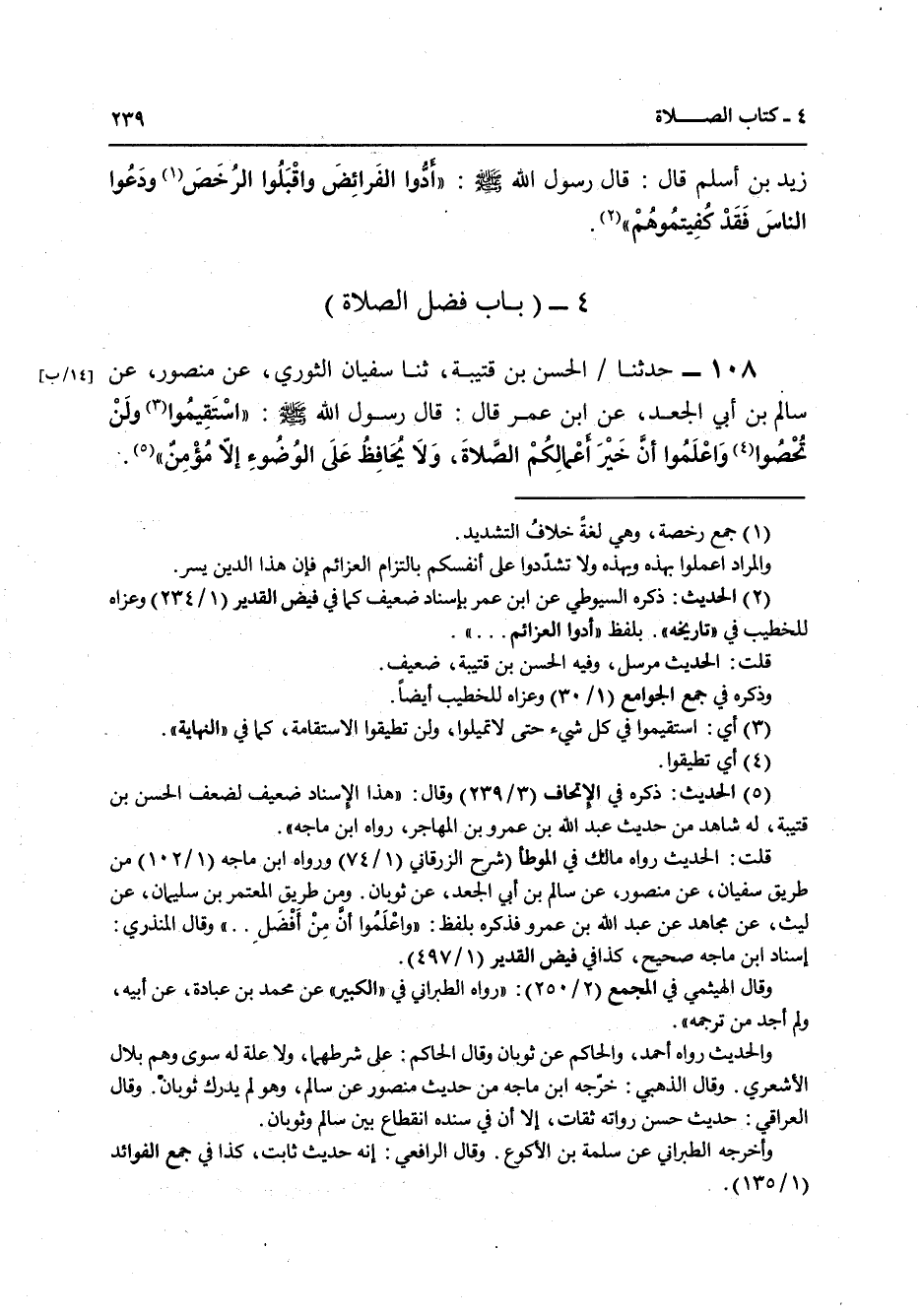 108 - حَدَّثَنَا الْحَسَنُ بْنُ قُتَيْبَةَ، ثنا سُفْيَانُ الثَّوْرِيُّ، عَنْ مَنْصُورٍ، عَنْ سَالِمِ بْنِ أَبِي الْجَعْدِ، عَنِ ابْنِ عُمَرَ قَالَ: قَالَ رَسُولُ اللَّهِ صَلَّى اللهُ عَلَيْهِ وَسَلَّمَ: «§اسْتَقِيمُوا وَلَنْ تُحْصُوا , وَاعْلَمُوا أَنَّ خَيْرَ أَعْمَالِكُمُ الصَّلَاةُ، وَلَا يُحَافِظُ عَلَى الْوُضُوءِ إِلَّا مُؤْمِنٌ»