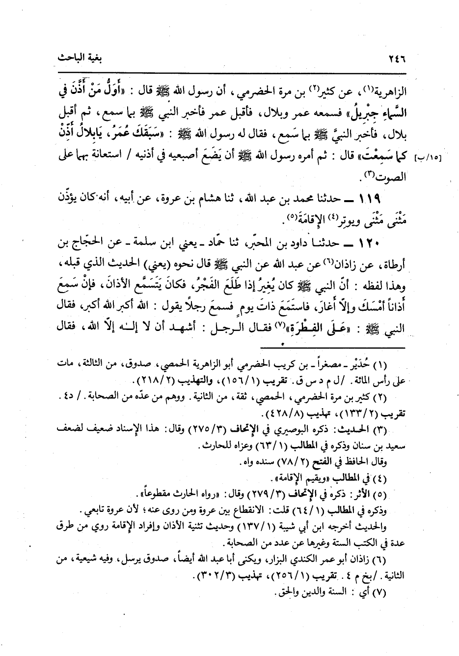 119 - حَدَّثَنَا مُحَمَّدُ بْنُ عَبْدِ اللَّهِ، ثنا هِشَامُ بْنُ عُرْوَةَ، عَنْ أَبِيهِ، أَنَّهُ كَانَ §يُؤَذِّنُ مَثْنَى مَثْنَى وَيُوتِرُ الْإِقَامَةَ