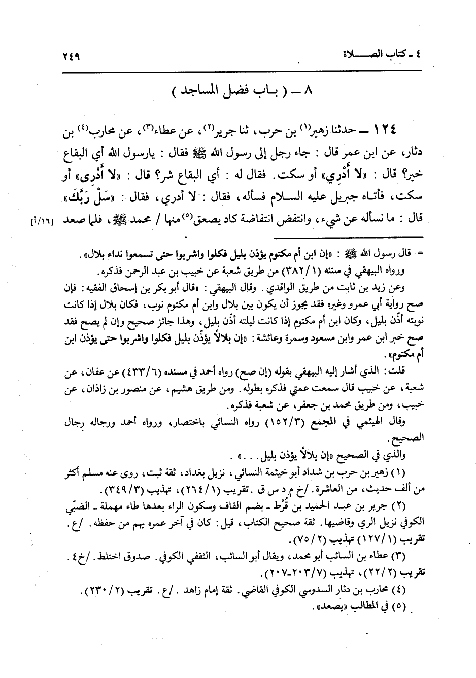 124 - حَدَّثَنَا زُهَيْرُ بْنُ حَرْبٍ، ثنا جَرِيرٌ، عَنْ عَطَاءٍ، عَنْ مُحَارِبِ بْنِ دِثَارٍ، عَنِ ابْنِ عُمَرَ قَالَ: جَاءَ رَجُلٌ إِلَى رَسُولِ اللَّهِ صَلَّى اللهُ عَلَيْهِ وَسَلَّمَ فَقَالَ: يَا رَسُولَ اللَّهِ " §أَيُّ الْبِقَاعِ خَيْرٌ؟ قَالَ: «لَا أَدْرِي» أَوْ سَكَتَ فَقَالَ لَهُ: أَيُّ الْبِقَاعِ شَرٌّ؟ قَالَ: «لَا أَدْرِي» أَوْ سَكَتَ فَأَتَاهُ جِبْرِيلُ عَلَيْهِ السَّلَامُ فَسَأَلَهُ فَقَالَ: «لَا أَدْرِي» فَقَالَ: سَلْ رَبَّكَ قَالَ: " مَا نَسْأَلُهُ عَنْ شَيْءٍ وَانْتَفَضَ انْتِفَاضَةً كَادَ يُصْعَقُ مِنْهَا مُحَمَّدٌ صَلَّى اللهُ عَلَيْهِ وَسَلَّمَ , فَلَمَّا صَعَدَ جِبْرِيلُ عَلَيْهِ السَّلَامُ قَالَ اللَّهُ عَزَّ وَجَلَّ: سَأَلَكَ مُحَمَّدٌ أَيُّ الْبِقَاعِ خَيْرٌ، فَقُلْتَ: لَا أَدْرِي؟ قَالَ: نَعَمْ، قَالَ: فَحَدِّثْهُ أَنَّ خَيْرَ الْبِقَاعِ الْمَسَاجِدُ، وَأَنَّ شَرَّ الْبِقَاعِ الْأَسْوَاقُ " قُلْتُ: وَحَدِيثُ جُبَيْرِ بْنِ مُطْعِمٍ فِي الْبُيُوعِ