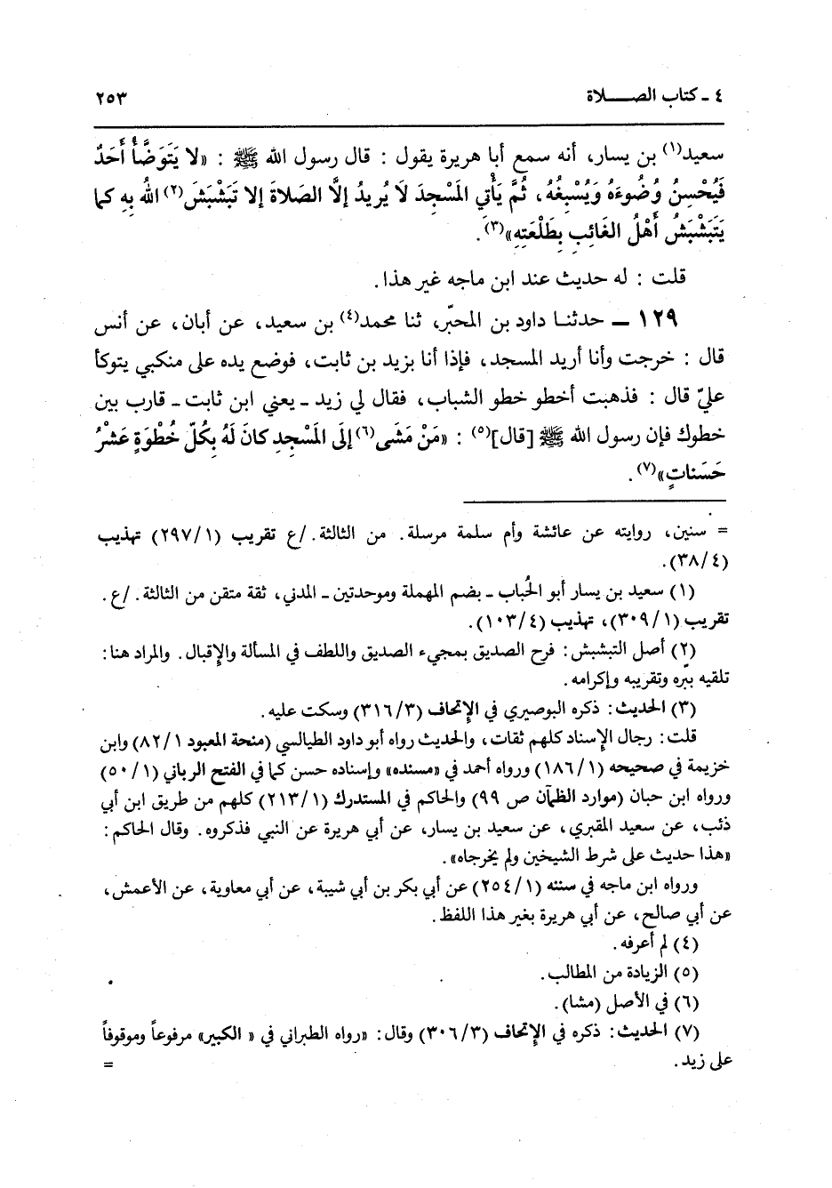 129 - حَدَّثَنَا دَاوُدُ بْنُ الْمُحَبَّرِ، ثنا مُحَمَّدُ بْنُ سَعِيدٍ، عَنْ أَبَانَ، عَنْ أَنَسٍ قَالَ: خَرَجْتُ وَأَنَا أُرِيدُ الْمَسْجِدَ فَإِذَا أَنَا بِزَيْدِ بْنِ ثَابِتٍ، فَوَضَعَ يَدَهُ عَلَى مَنْكِبِي يَتَوَكَّأُ عَلَيَّ، قَالَ: فَذَهَبْتُ أَخْطُو خَطْوَ الشَّبَابِ، فَقَالَ لِي زَيْدٌ يَعْنِي ابْنَ ثَابِتٍ: قَارِبْ بَيْنَ خَطْوِكَ، فَإِنَّ رَسُولَ اللَّهِ صَلَّى اللهُ عَلَيْهِ وَسَلَّمَ قَالَ: «§مَنْ مَشَى إِلَى الْمَسْجِدِ كَانَ لَهُ بِكُلِّ خُطْوَةٍ عَشْرُ حَسَنَاتٍ»
