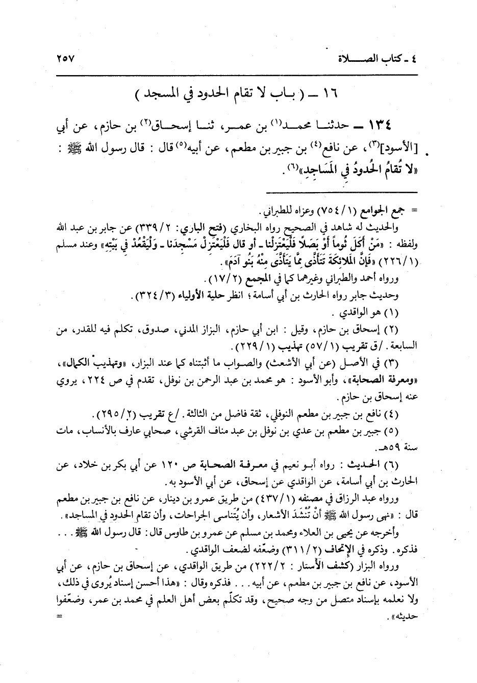 134 - حَدَّثَنَا مُحَمَّدُ بْنُ عُمَرَ، ثَنَا إِسْحَاقُ بْنُ حَازِمٍ، عَنْ أَبِي الْأَسْوَدِ، عَنْ نَافِعِ بْنِ جُبَيْرِ بْنِ مُطْعِمٍ، عَنْ أَبِيهِ، قَالَ: قَالَ رَسُولُ اللَّهِ صَلَّى اللهُ عَلَيْهِ وَسَلَّمَ «§لَا تُقَامُ الْحُدُودُ فِي الْمَسَاجِدِ»
