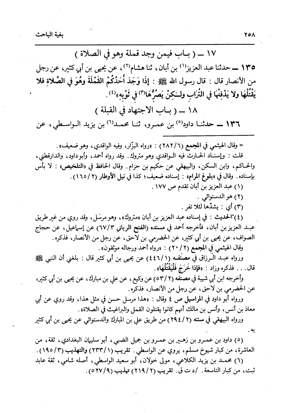135 - حَدَّثَنَا عَبْدُ الْعَزِيزِ بْنُ أَبَانَ، ثنا هِشَامٌ، عَنْ يَحْيَى بْنِ أَبِي كَثِيرٍ، عَنْ رَجُلٍ مِنَ الْأَنْصَارِ قَالَ: قَالَ رَسُولُ اللَّهِ صَلَّى اللهُ عَلَيْهِ وَسَلَّمَ: «§إِذَا وَجَدَ أَحَدُكُمُ الْقَمْلَةَ وَهُوَ فِي الصَّلَاةِ فَلَا يَقْتُلْهَا وَلَا يَدْفِنْهَا فِي التُّرَابِ وَلَكِنْ يَصُرُّهَا فِي ثَوْبِهِ»