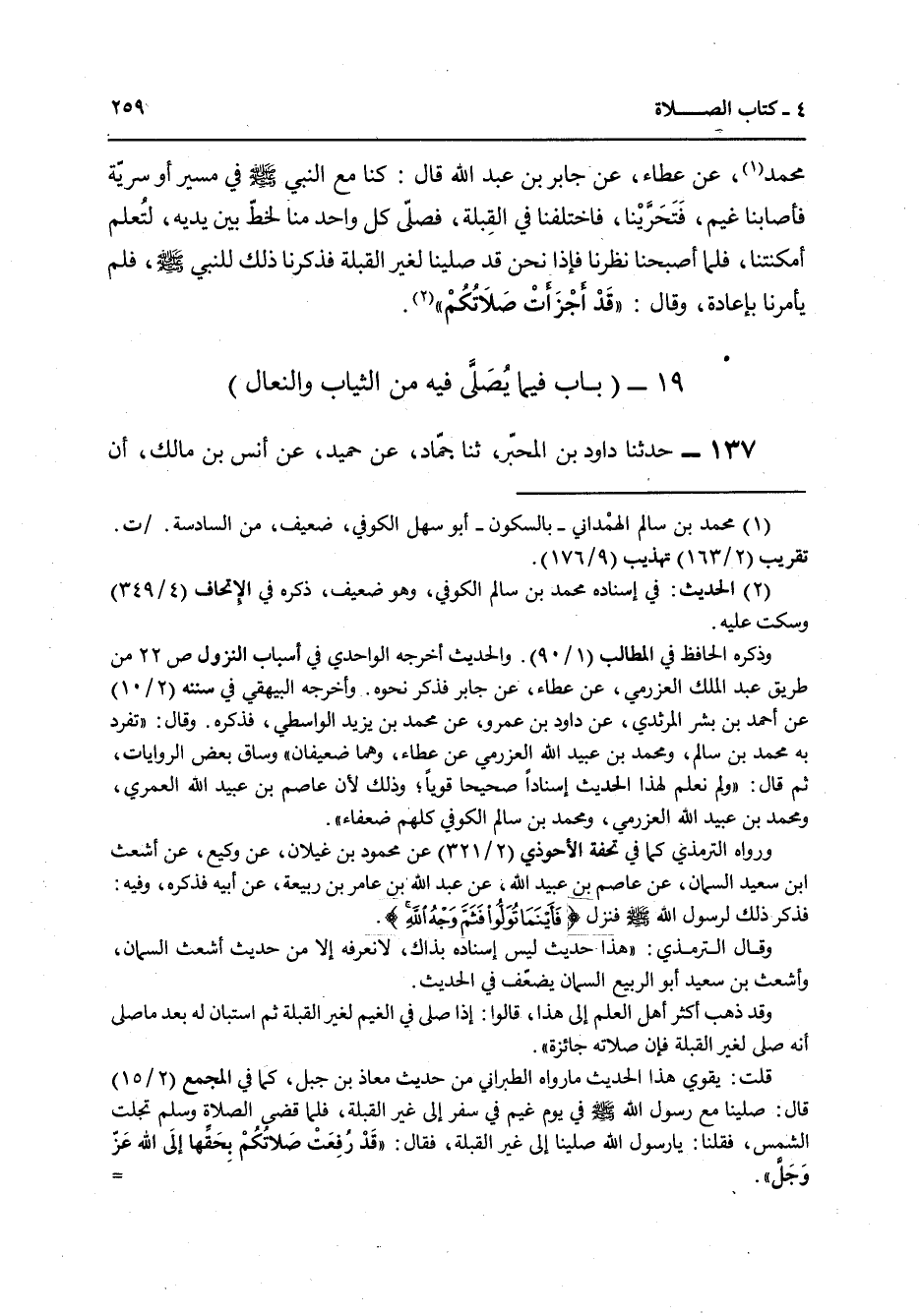 137 - حَدَّثَنَا دَاوُدُ بْنُ الْمُحَبَّرِ، ثنا حَمَّادٌ، عَنْ حُمَيْدٍ، عَنْ أَنَسِ بْنِ مَالِكٍ أَنَّ رَسُولَ اللَّهِ صَلَّى اللهُ عَلَيْهِ وَسَلَّمَ «§خَرَجَ مُتَوَكِّئًا عَلَى أُسَامَةَ وَعَلَيْهِ ثَوْبٌ قَطَرِيٌّ مُتَوَشِّحًا فَصَلَّى بِهِمْ فِيهِ لَيْسَ عَلَيْهِ غَيْرُهُ»