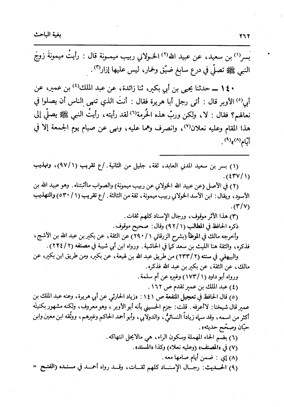 140 - حَدَّثَنَا يَحْيَى بْنُ أَبِي بُكَيْرٍ، ثنا زَائِدَةُ، عَنْ عَبْدِ الْمَلِكِ بْنِ عُمَيْرٍ، عَنْ أَبِي الْأَوْبَرِ قَالَ: أَتَى رَجُلٌ أَبَا هُرَيْرَةَ فَقَالَ: أَنْتَ الَّذِي تَنْهَى النَّاسَ أَنْ يُصَلُّوا فِي نِعَالِهِمْ فَقَالَ: لَا وَلَكِنْ وَرَبِّ هَذِهِ الْحُرْمَةِ لَقَدْ رَأَيْتُهُ , رَأَيْتُ النَّبِيَّ صَلَّى اللهُ عَلَيْهِ وَسَلَّمَ «§يُصَلِّي إِلَى هَذَا الْمَقَامِ وَعَلَيْهِ نَعْلَانِ وَانْصَرَفَ وَهُمَا عَلَيْهِ وَنَهَى عَنْ صِيَامِ يَوْمِ الْجُمُعَةِ إِلَّا فِي أَيَّامٍ»