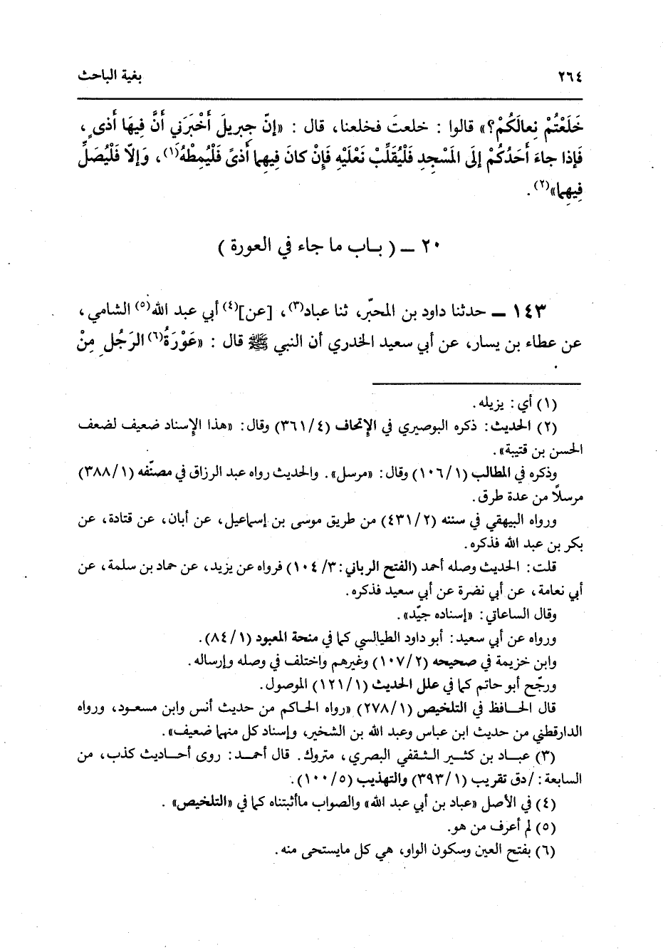 143 - حَدَّثَنَا دَاوُدُ بْنُ الْمُحَبَّرِ، ثنا عَبَّادٌ، عَنْ أَبِي عَبْدِ اللَّهِ الشَّامِيِّ، عَنْ عَطَاءِ بْنِ يَسَارٍ، عَنْ أَبِي سَعِيدٍ الْخُدْرِيِّ أَنَّ النَّبِيَّ صَلَّى اللهُ عَلَيْهِ وَسَلَّمَ قَالَ: «§عَوْرَةُ الرَّجُلِ مِنْ سُرَّتِهِ إِلَى رُكْبَتِهِ»