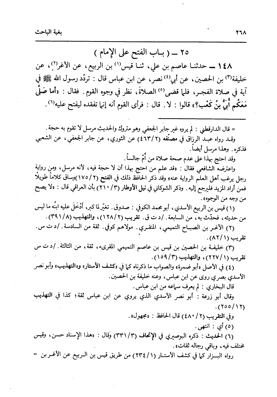 148 - حَدَّثَنَا عَاصِمُ بْنُ عَلِيٍّ، ثنا قَيْسُ بْنُ الرَّبِيعِ، عَنِ الْأَغَرِّ، عَنْ خَلِيفَةَ بْنِ الْحُصَيْنِ، عَنْ أَبِي نَصْرٍ، عَنِ ابْنِ عَبَّاسٍ قَالَ: تَرَدَّدَ رَسُولُ اللَّهِ صَلَّى اللهُ عَلَيْهِ وَسَلَّمَ فِي آيَةٍ فِي صَلَاةِ الْفَجْرِ فَلَمَّا قَضَى الصَّلَاةَ نَظَرَ فِي وُجُوهِ الْقَوْمِ فَقَالَ: «§أَمَا صَلَّى مَعَكُمْ أُبَيُّ بْنُ كَعْبٍ؟» قَالُوا: لَا، قَالَ: فَرَأَى الْقَوْمُ أَنَّهُ إِنَّمَا تَفَقَّدَهُ لِيَفْتَحَ عَلَيْهِ "