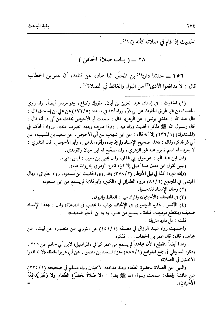 156 - حَدَّثَنَا دَاوُدُ بْنُ الْمُحَبَّرِ، ثنا حَمَّادٌ، عَنْ قَتَادَةَ، أَنَّ عُمَرَ بْنَ الْخَطَّابِ قَالَ: «§لَا تُدَافِعُوا الْأَذَى مِنَ الْبَوْلِ وَالْغَائِطِ فِي الصَّلَاةِ»