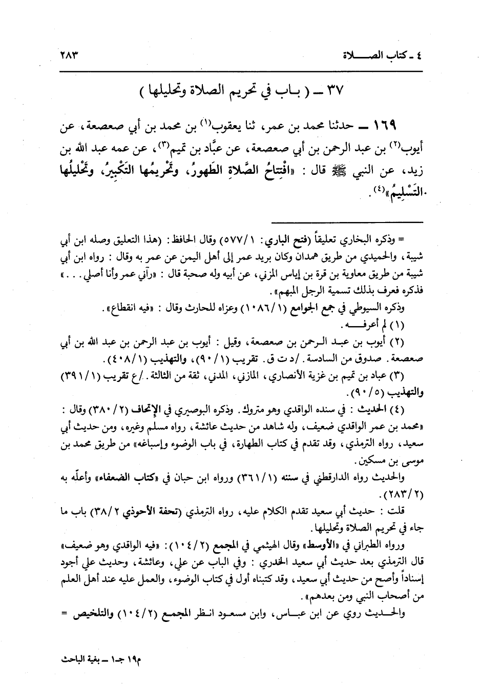 169 - حَدَّثَنَا مُحَمَّدُ بْنُ عُمَرَ، ثنا يَعْقُوبُ بْنُ مُحَمَّدِ بْنِ أَبِي صَعْصَعَةَ، عَنْ أَيُّوبَ بْنِ عَبْدِ الرَّحْمَنِ بْنِ أَبِي صَعْصَعَةَ، عَنْ عَبَّادِ بْنِ تَمِيمٍ، عَنْ عَمِّهِ عَبْدِ اللَّهِ بْنِ زَيْدٍ عَنِ النَّبِيِّ صَلَّى اللهُ عَلَيْهِ وَسَلَّمَ قَالَ: «§افْتِتَاحُ الصَّلَاةِ الطُّهُورُ وَتَحْرِيمُهَا التَّكْبِيرُ وَتَحْلِيلُهَا التَّسْلِيمُ»