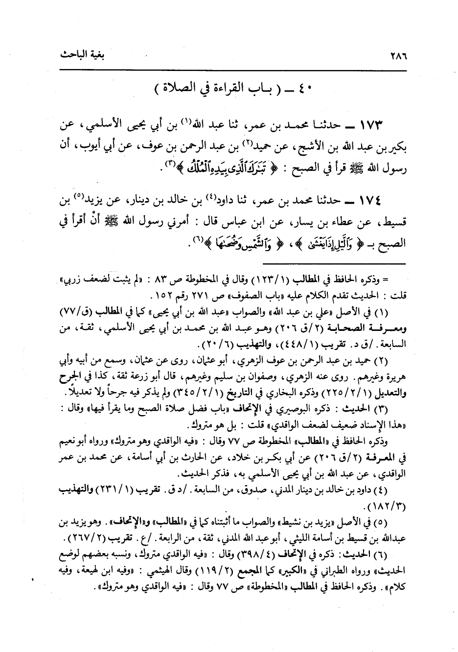 173 - حَدَّثَنَا مُحَمَّدُ بْنُ عُمَرَ، ثنا عَبْدُ اللَّهِ بْنُ أَبِي يَحْيَى الْأَسْلَمَيُّ، عَنْ بُكَيْرِ بْنِ عَبْدِ اللَّهِ بْنِ الْأَشَجِّ، عَنْ حُمَيْدِ بْنِ عَبْدِ الرَّحْمَنِ بْنِ عَوْفٍ، عَنْ أَبِي أَيُّوبَ أَنَّ رَسُولَ اللَّهِ صَلَّى اللهُ عَلَيْهِ وَسَلَّمَ «§قَرَأَ فِي الصُّبْحِ تَبَارَكَ الَّذِي بِيَدِهِ الْمُلْكُ»
