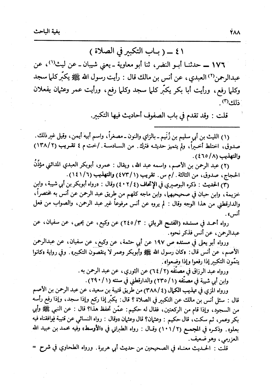 176 - حَدَّثَنَا أَبُو النَّضْرِ، ثنا أَبُو مُعَاوِيَةَ يَعْنِي شَيْبَانَ، عَنْ لَيْثٍ، عَنْ عَبْدِ الرَّحْمَنِ الْعَبْدِيِّ، عَنْ أَنَسِ بْنِ مَالِكٍ قَالَ: رَأَيْتُ رَسُولَ اللَّهِ صَلَّى اللهُ عَلَيْهِ وَسَلَّمَ «§يُكَبِّرُ كُلَّمَا سَجَدَ وَكُلَّمَا رَفَعَ , وَرَأَيْتُ أَبَا بَكْرٍ يُكَبِّرُ كُلَّمَا سَجَدَ وَكُلَّمَا رَفَعَ , وَرَأَيْتُ عُمَرَ وَعُثْمَانَ يَفْعَلَانِ ذَلِكَ» , قُلْتُ: وَقَدْ تَقَدَّمَ فِي بَابِ الصُّفُوفِ أَحَادِيثُ فِيهَا التَّكْبِيرُ