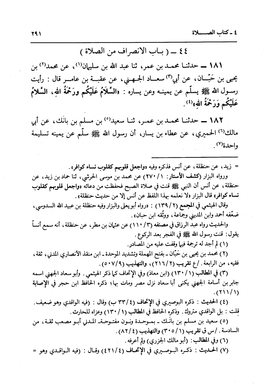 181 - حَدَّثَنَا مُحَمَّدُ بْنُ عُمَرَ، ثنا عَبْدُ اللَّهِ بْنُ سُلَيْمَانَ، عَنْ مُحَمَّدِ بْنِ يَحْيَى بْنِ حَبَّانَ، عَنْ أَبِي سُعَادٍ الْجُهَنِيِّ، عَنْ عُقْبَةَ بْنِ عَامِرٍ قَالَ: رَأَيْتُ رَسُولَ اللَّهِ صَلَّى اللهُ عَلَيْهِ وَسَلَّمَ " §يُسَلِّمُ عَنْ يَمِينِهِ وَعَنْ يَسَارِهِ: السَّلَامُ عَلَيْكُمْ وَرَحْمَةُ اللَّهِ السَّلَامُ عَلَيْكُمْ وَرَحْمَةُ اللَّهِ "