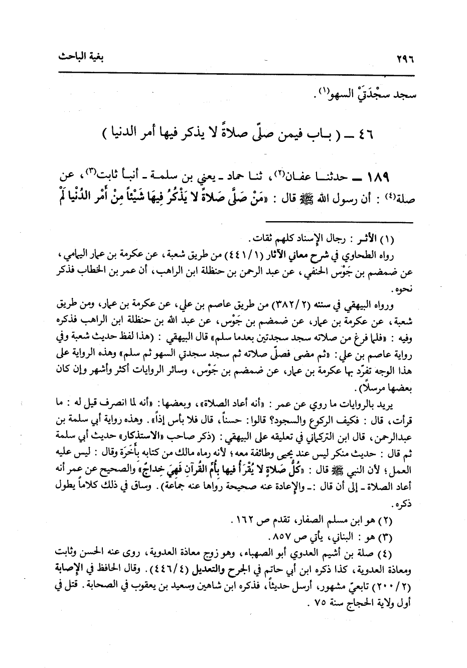 189 - حَدَّثَنَا عَفَّانُ، ثنا حَمَّادٌ يَعْنِي ابْنَ سَلَمَةَ، أَنْبَأَ ثَابِتٌ، عَنْ صِلَةَ أَنَّ رَسُولَ اللَّهِ صَلَّى اللهُ عَلَيْهِ وَسَلَّمَ قَالَ: «§مَنْ صَلَّى صَلَاةً لَا يَذْكُرُ فِيهَا شَيْئًا مِنْ أَمْرِ الدُّنْيَا لَمْ يَسْأَلِ اللَّهَ عَزَّ وَجَلَّ فِيهَا شَيْئًا إِلَّا أَعْطَاهُ إِيَّاهُ»