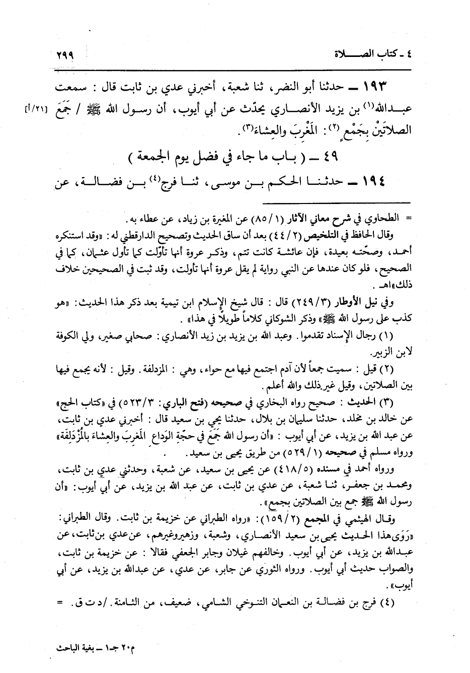 193 - حَدَّثَنَا أَبُو النَّضْرِ، ثنا شُعْبَةُ، أَخْبَرَنِي عَدِيُّ بْنُ ثَابِتٍ قَالَ: سَمِعْتُ عَبْدَ اللَّهِ بْنَ يَزِيدَ الْأَنْصَارِيَّ، يُحَدِّثُ عَنْ أَبِي أَيُّوبَ أَنَّ رَسُولَ اللَّهِ صَلَّى اللهُ عَلَيْهِ وَسَلَّمَ «§جَمَعَ الصَّلَاتَيْنِ بِجَمْعِ الْمَغْرِبِ وَالْعِشَاءِ»
