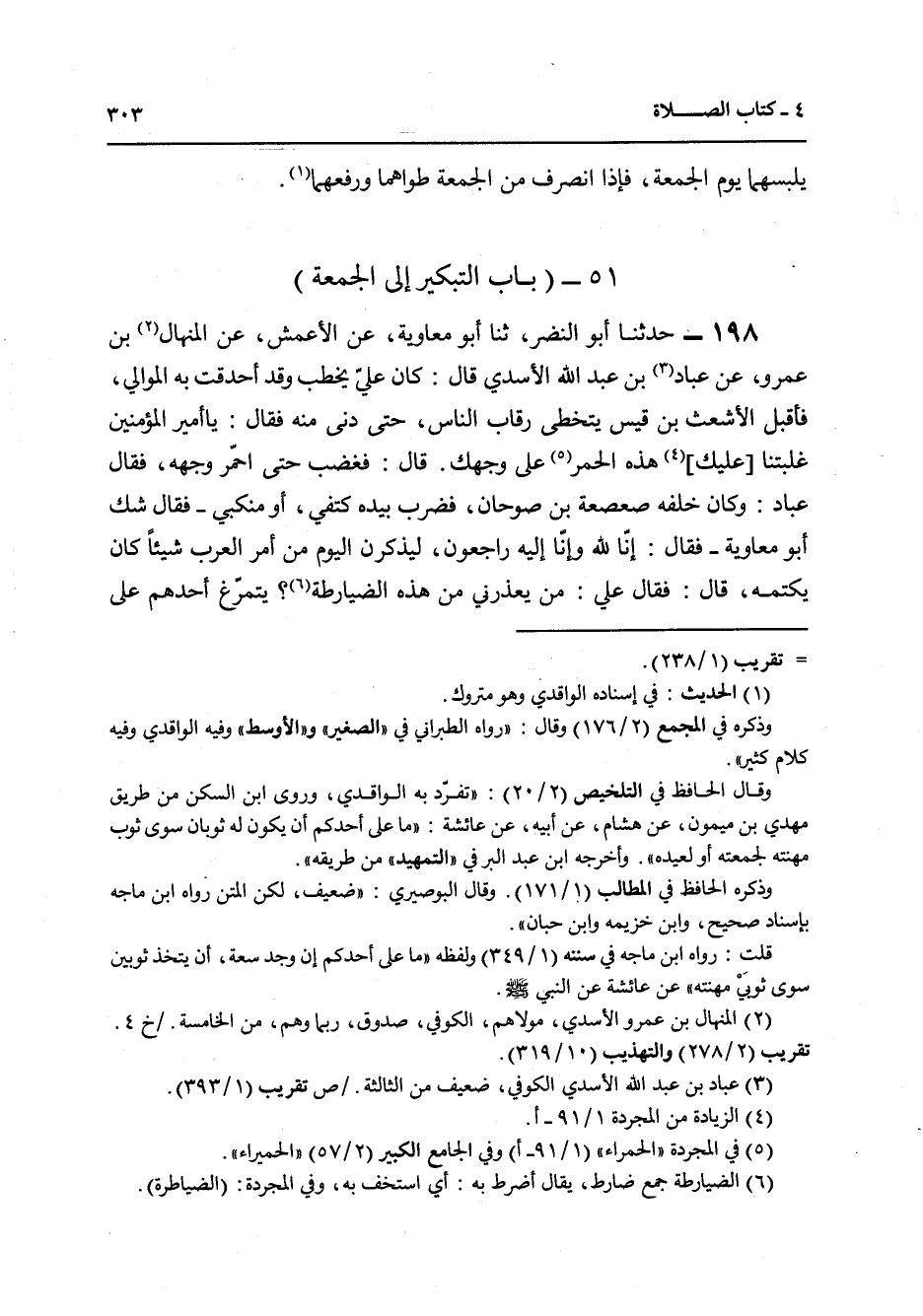 198 - حَدَّثَنَا أَبُو النَّضْرِ، ثنا أَبُو مُعَاوِيَةَ، عَنِ الْأَعْمَشِ، عَنِ الْمِنْهَالِ بْنِ عَمْرٍو، عَنْ عَبَّادِ بْنِ عَبْدِ اللَّهِ الْأَسَدِيِّ قَالَ: كَانَ عَلِيٌّ يَخْطُبُ وَقَدْ أَحْدَقَتْ بِهِ الْمَوَالِي فَأَقْبَلَ الْأَشْعَثُ بْنُ قَيْسٍ يَتَخَطَّى رِقَابَ النَّاسِ حَتَّى دَنَا مِنْهُ فَقَالَ: يَا أَمِيرَ الْمُؤْمِنِينَ غَلَبَتْنَا عَلَيْكَ هَذِهِ الْحُمَيْرَاءُ عَلَى وَجْهِكَ قَالَ: فَغَضِبَ حَتَّى احْمَرَّ وَجْهُهُ، فَقَالَ عَبَّادٌ: وَكَانَ خَلْفَهُ صَعْصَعَةُ بْنُ صُوحَانَ فَضَرَبَ بِيَدِهِ كَتِفِي أَوْ مَنْكِبِي فَقَالَ: شَكَّ أَبُو مُعَاوِيَةَ فَقَالَ: إِنَّا لِلَّهَ وَإِنَّا إِلَيْهِ رَاجِعُونَ، لَيَذْكُرَنَّ الْيَوْمَ مِنْ أَمْرِ الْعَرَبِ شَيْئًا كَانَ يَكْتُمْهُ، قَالَ: فَقَالَ عَلِيٌّ: مَنْ يَعْذِرُنِي مِنْ هَذِهِ الضَّيَارِطَةِ , يَتَمَرَّغُ أَحَدُهُمْ عَلَى حَشَايَاهُ، وَيُهَجِّرُ قَوْمٌ لِذِكْرِ اللَّهِ فَيَأْمُرُنِي أَنْ أَطْرُدَهُمْ فَأَكُونَ مِنَ الظَّالِمِينَ، أَمَا وَالَّذِي فَلَقَ الْحَبَّةَ وَبَرَأَ النَّسَمَةَ، لَقَدْ سَمِعْتُ رَسُولَ اللَّهِ صَلَّى اللهُ عَلَيْهِ وَسَلَّمَ يَقُولُ: «§لَيَضْرِبُنَّكُمْ عَلَى الدِّينِ عَوْدًا كَمَا ضَرَبْتُمُوهُمْ عَلَيْهِ بَدْءًا»