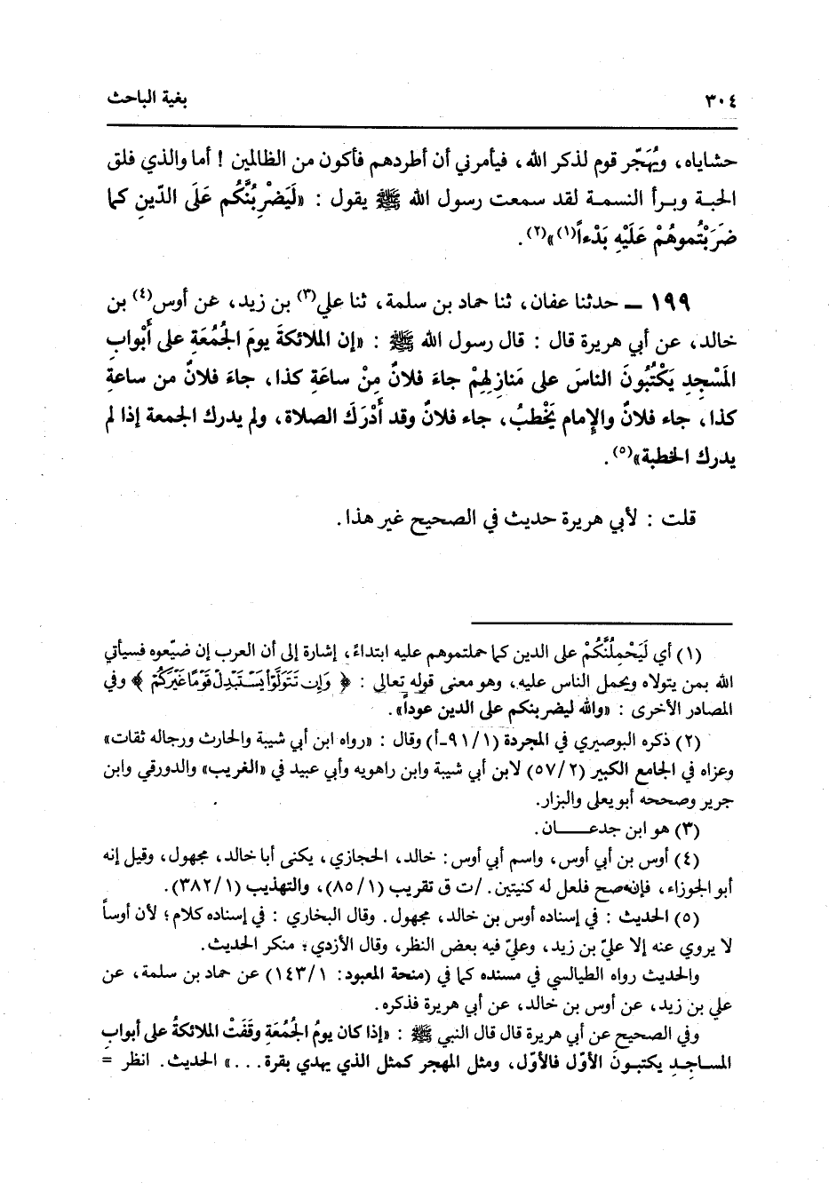 199 - حَدَّثَنَا عَفَّانُ، ثنا حَمَّادُ بْنُ سَلَمَةَ، ثنا عَلِيُّ بْنُ زَيْدٍ، عَنْ أَوْسِ بْنِ خَالِدٍ، عَنْ أَبِي هُرَيْرَةَ قَالَ: قَالَ رَسُولُ اللَّهِ صَلَّى اللهُ عَلَيْهِ وَسَلَّمَ: «إِنَّ §الْمَلَائِكَةَ يَوْمَ الْجُمُعَةِ عَلَى أَبْوَابِ الْمَسْجِدِ يَكْتُبُونَ النَّاسَ عَلَى مَنَازِلِهِمْ , جَاءَ فُلَانٌ مِنْ سَاعَةِ كَذَا , جَاءَ فُلَانٌ مِنْ سَاعَةِ كَذَا , جَاءَ فُلَانٌ وَالْإِمَامُ يَخْطُبُ , جَاءَ فُلَانٌ وَقَدْ أَدْرَكَ الصَّلَاةَ وَلَمْ يُدْرِكِ الْجُمُعَةَ إِذَا لَمْ يُدْرِكِ الْخُطْبَةَ» , قُلْتُ: لِأَبِي هُرَيْرَةَ حَدِيثٌ فِي الصَّحِيحِ غَيْرُ هَذَا