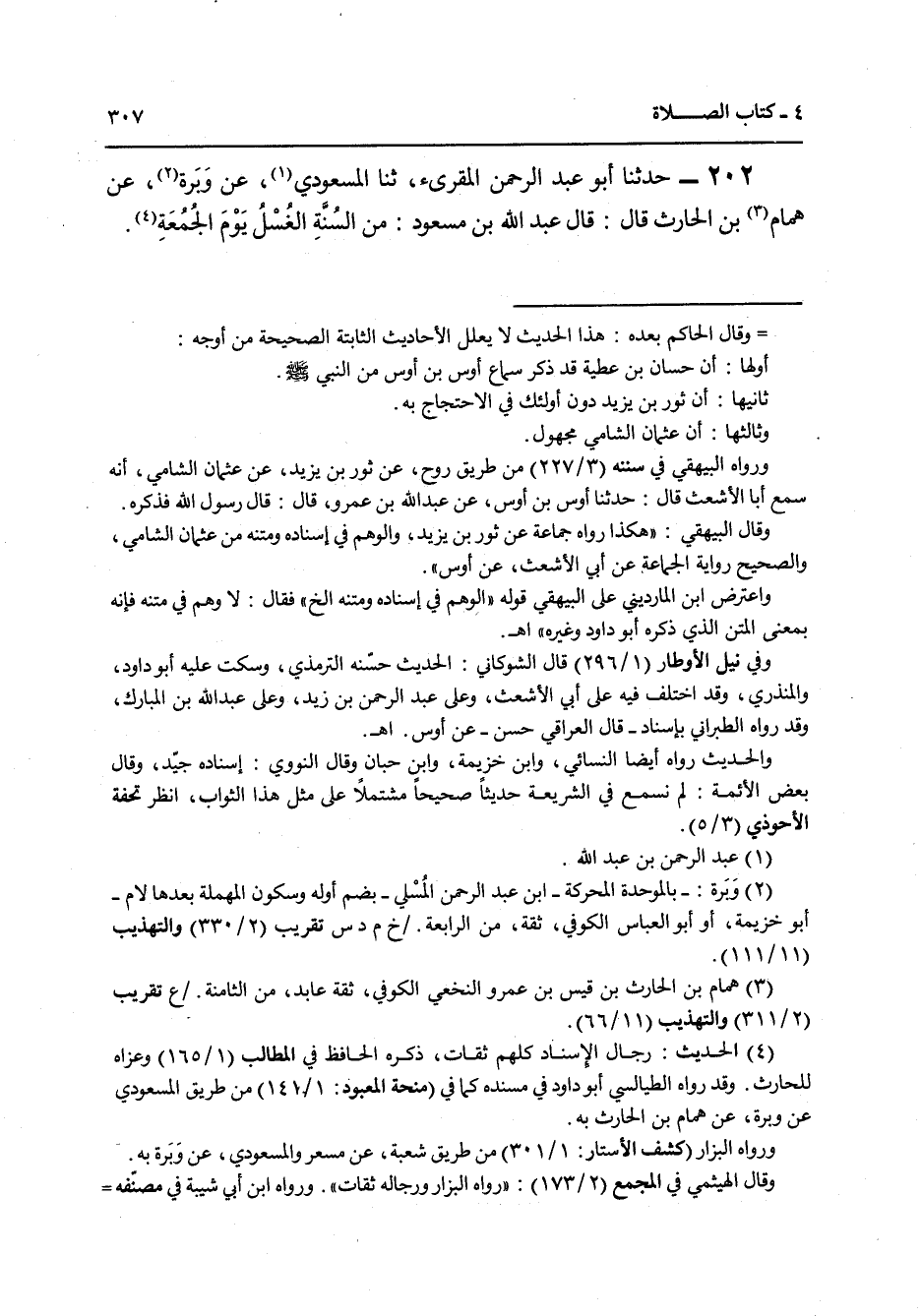 202 - حَدَّثَنَا أَبُو عَبْدِ الرَّحْمَنِ الْمُقْرِئُ، ثنا الْمَسْعُودِيُّ، عَنْ وَبَرَةَ، عَنْ هَمَّامِ بْنِ الْحَارِثِ قَالَ: قَالَ عَبْدُ اللَّهِ بْنُ مَسْعُودٍ: «§مِنَ السُّنَّةِ الْغُسْلُ يَوْمَ الْجُمُعَةِ»