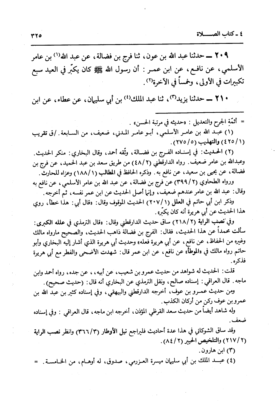 209 - حَدَّثَنَا عَبْدُ اللَّهِ بْنُ عَوْنٍ، ثنا فَرَجُ بْنُ فَضَالَةَ، عَنْ عَبْدِ اللَّهِ بْنِ عَامِرٍ الْأَسْلَمِيِّ، عَنْ نَافِعٍ، عَنِ ابْنِ عُمَرَ أَنَّ رَسُولَ اللَّهِ صَلَّى اللهُ عَلَيْهِ وَسَلَّمَ كَانَ «§يُكَبِّرُ فِي الْعِيدِ سَبْعَ تَكْبِيرَاتٍ فِي الْأُولَى وَخَمْسًا فِي الْآخِرَةِ»