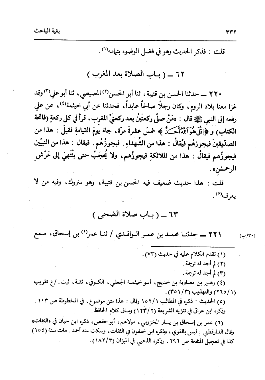 220 - حَدَّثَنَا الْحَسَنُ بْنُ قُتَيْبَةَ، ثنا أَبُو الْحَسَنِ الْمِصِّيصِيُّ، ثنا أَبُو عَلِيٍّ، وَقَدْ غَزَا مَعَنَا بِلَادَ الرُّومِ وَكَانَ رَجُلًا صَالِحًا عَابِدًا فَحَدَّثَنَا عَنْ أَبِي خَيْثَمَةَ , عَنْ عَلِيٍّ رَفَعَهُ إِلَى النَّبِيِّ صَلَّى اللهُ عَلَيْهِ وَسَلَّمَ قَالَ: " §مَنْ صَلَّى رَكْعَتَيْنِ بَعْدَ رَكْعَتَيِ الْمَغْرِبِ قَرَأَ فِي كُلِّ رَكْعَةٍ فَاتِحَةَ الْكِتَابِ وَقُلْ هُوَ اللَّهُ أَحَدٌ خَمْسَ عَشَرَةَ مَرَّةً جَاءَ يَوْمَ الْقِيَامَةِ فَقِيلَ: هَذَا مِنَ الصِّدِّيقِينَ، فَيَجُوزُهُمْ , فَيُقَالَ: هَذَا مِنَ الشُّهَدَاءِ فَيَجُوزُهُمْ , فَيُقَالَ: هَذَا مِنَ النَّبِيِّينَ، فَيَجُوزُهُمْ , فَيُقَالَ: هَذَا مِنَ الْمَلَائِكَةِ، فَيَجُوزُهُمْ، وَلَا يُحْجَبُ حَتَّى يَنْتَهِيَ إِلَى عَرْشِ الرَّحْمَنِ " , قُلْتُ: هَذَا حَدِيثٌ ضَعِيفٌ فِيهِ الْحَسَنُ بْنُ قُتَيْبَةَ وَهُوَ مَتْرُوكٌ وَفِيهِ مَنْ لَا يُعْرَفُ