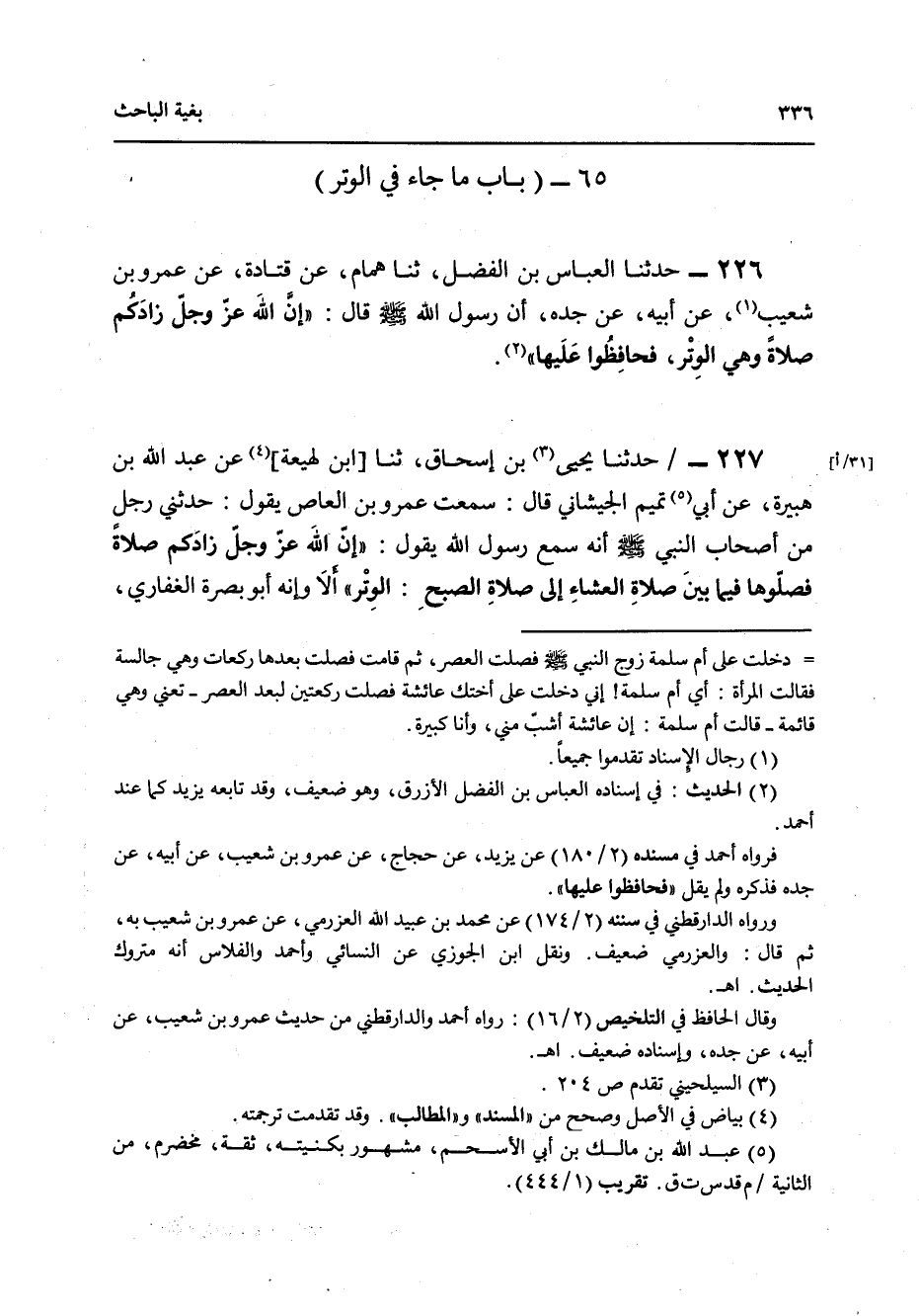 226 - حَدَّثَنَا الْعَبَّاسُ بْنُ الْفَضْلِ، ثنا هَمَّامٌ، عَنْ قَتَادَةَ، عَنْ عَمْرِو بْنِ شُعَيْبٍ، عَنْ أَبِيهِ، عَنْ جَدِّهِ أَنَّ رَسُولَ اللَّهِ صَلَّى اللهُ عَلَيْهِ وَسَلَّمَ قَالَ: إِنَّ «§اللَّهَ عَزَّ وَجَلَّ زَادَكُمْ صَلَاةً وَهِيَ الْوِتْرُ فَحَافِظُوا عَلَيْهَا»