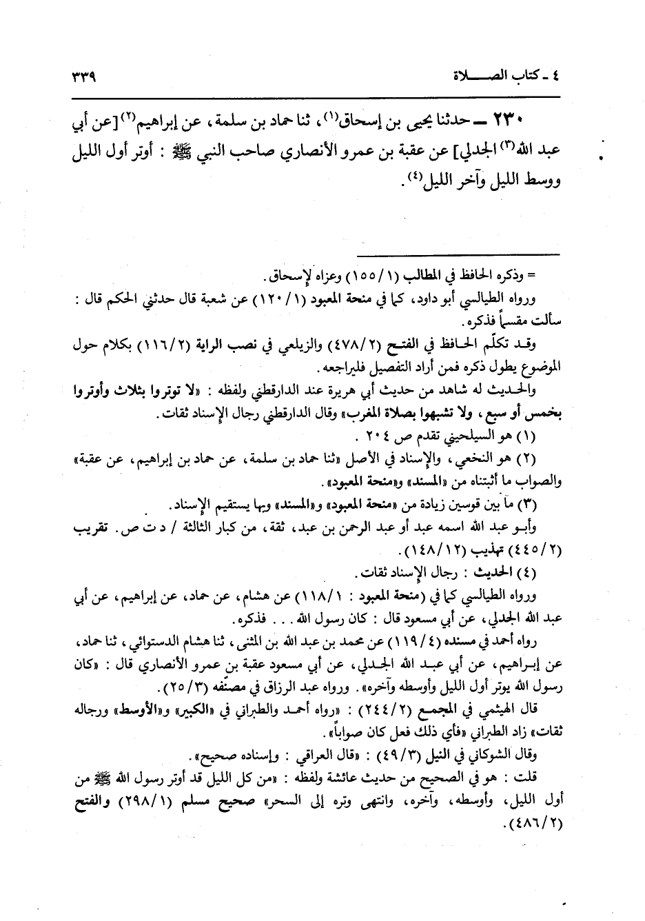 230 - حَدَّثَنَا يَحْيَى بْنُ إِسْحَاقَ، ثنا حَمَّادُ بْنُ سَلَمَةَ، عَنْ إِبْرَاهِيمَ، عَنْ أَبِي عَبْدِ اللَّهِ الْجَدَلِيِّ، عَنْ عُقْبَةَ بْنِ عَمْرٍو الْأَنْصَارِيِّ صَاحِبِ النَّبِيِّ صَلَّى اللهُ عَلَيْهِ وَسَلَّمَ «§أَوْتَرَ أَوَّلَ اللَّيْلِ وَوَسَطَ اللَّيْلِ وَآخَرَ اللَّيْلِ»