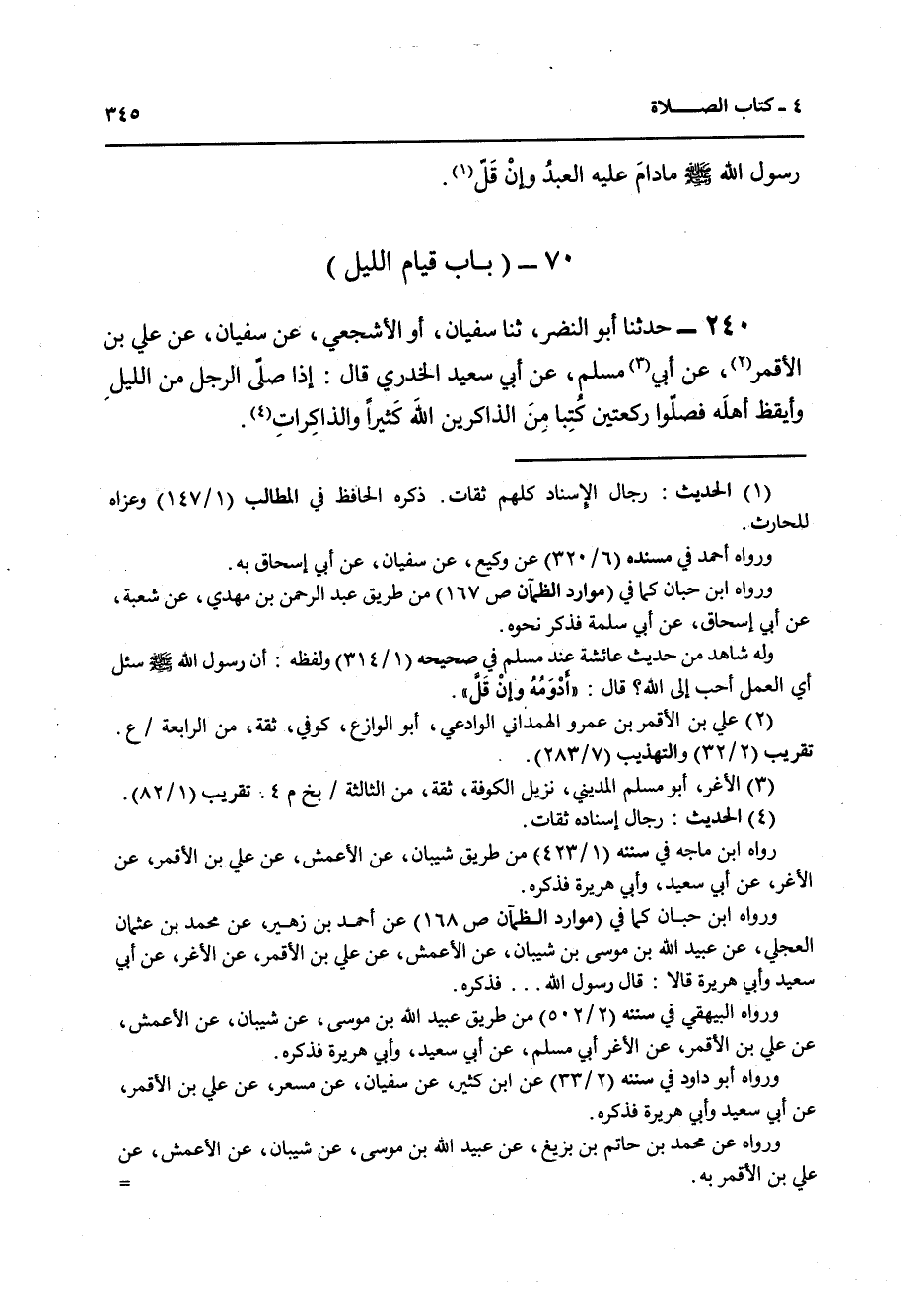 240 - حَدَّثَنَا أَبُو النَّضْرِ، ثنا سُفْيَانُ أَوِ الْأَشْجَعِيُّ، عَنْ سُفْيَانَ، عَنْ عَلِيِّ بْنِ الْأَقْمَرِ، عَنْ أَبِي مُسْلِمٍ، عَنْ أَبِي سَعِيدٍ الْخُدْرِيِّ قَالَ: «§إِذَا صَلَّى الرَّجُلُ مِنَ اللَّيْلِ وَأَيْقَظَ أَهْلَهُ فَصَلُّوا رَكْعَتَيْنِ كُتِبَا مِنَ الذَّاكِرِينَ اللَّهَ كَثِيرًا وَالذَّاكِرَاتِ»