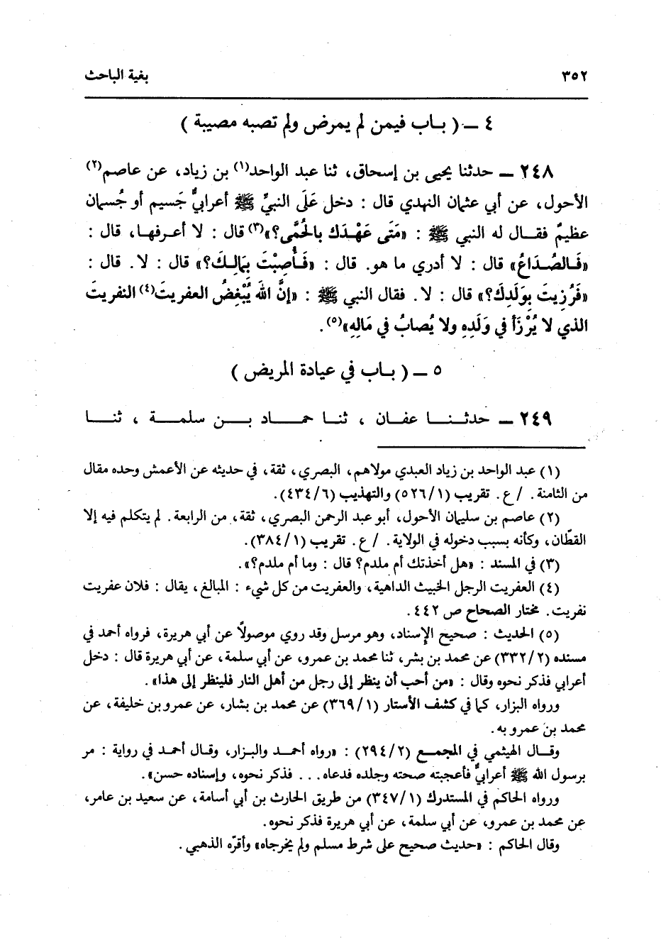 248 - حَدَّثَنَا يَحْيَى بْنُ إِسْحَاقَ، ثنا عَبْدُ الْوَاحِدِ بْنُ زِيَادٍ، عَنْ عَاصِمٍ الْأَحْوَلِ، عَنْ أَبِي عُثْمَانَ النَّهْدِيِّ قَالَ: دَخَلَ عَلَى النَّبِيِّ صَلَّى اللهُ عَلَيْهِ وَسَلَّمَ أَعْرَابِيٌّ جَسِيمٌ أَوْ جَسْمَانٌ عَظِيمٌ فَقَالَ لَهُ النَّبِيُّ صَلَّى اللهُ عَلَيْهِ وَسَلَّمَ: «§مَتَى عَهْدُكَ بِالْحُمَّى؟» قَالَ: لَا أَعْرِفُهَا قَالَ: «فَالصُّدَاعُ؟» قَالَ: لَا أَدْرِي مَا هُوَ، قَالَ: «فَأُصِبْتَ بِمَالِكَ؟» قَالَ: لَا , قَالَ: «فَرُزِيتَ بِوَلَدِكَ؟» قَالَ: لَا , فَقَالُ النَّبِيُّ صَلَّى اللهُ عَلَيْهِ وَسَلَّمَ: «إِنَّ اللَّهَ يُبْغِضُ الْعِفْرِيتَ النِّفْرِيتَ الَّذِي لَا يُرْزَأُ فِي وَلَدِهِ وَلَا يُصَابُ فِي مَالِهِ»