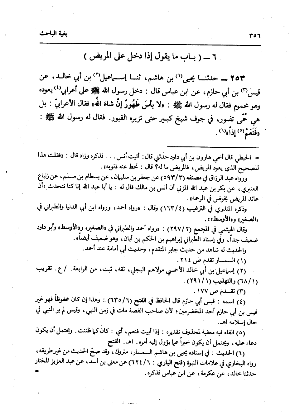 253 - حَدَّثَنَا يَحْيَى بْنُ هَاشِمٍ، ثنا إِسْمَاعِيلُ بْنُ أَبِي خَالِدٍ، عَنْ قَيْسِ بْنِ أَبِي حَازِمٍ، عَنِ ابْنِ عَبَّاسٍ قَالَ: دَخَلَ رَسُولُ اللَّهِ صَلَّى اللهُ عَلَيْهِ وَسَلَّمَ عَلَى أَعْرَابِيٍّ يَعُودُهُ وَهُوَ مَحْمُومٌ فَقَالَ لَهُ رَسُولُ اللَّهِ صَلَّى اللهُ عَلَيْهِ وَسَلَّمَ: «§لَا بَأْسَ طَهُورٌ إِنْ شَاءَ اللَّهُ» , فَقَالَ الْأَعْرَابِيُّ: هِيَ حُمَّى تَفُورُ فِي جَوْفِ شَيْخٍ كَبِيرٍ حَتَّى تُزِيرَهُ الْقُبُورَ , فَقَالَ لَهُ رَسُولُ اللَّهِ صَلَّى اللهُ عَلَيْهِ وَسَلَّمَ: «فَنَعَمْ إِذًا»