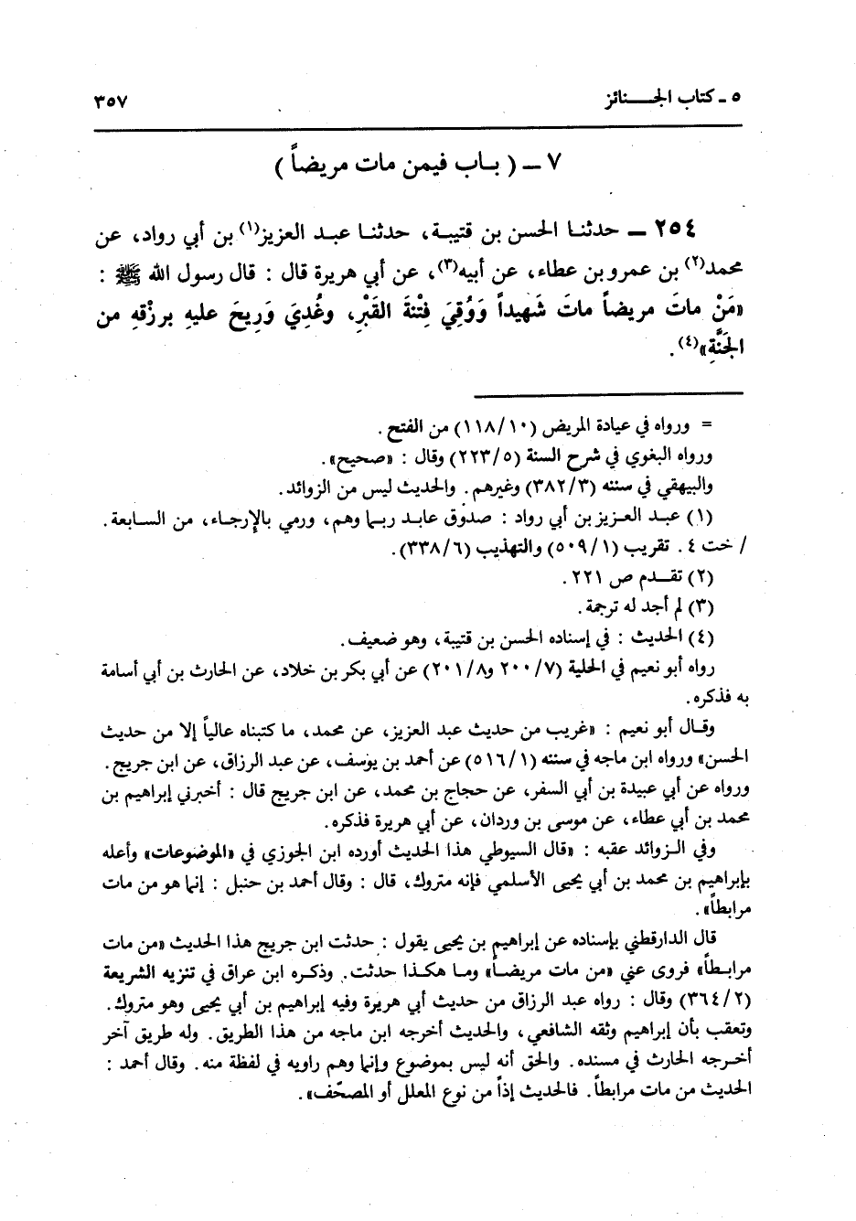 254 - حَدَّثَنَا الْحَسَنُ بْنُ قُتَيْبَةَ، حَدَّثَنَا عَبْدُ الْعَزِيزِ بْنُ أَبِي رَوَّادٍ، عَنْ مُحَمَّدِ بْنِ عَمْرِو بْنِ عَطَاءٍ، عَنْ أَبِيهِ، عَنْ أَبِي هُرَيْرَةَ قَالَ: قَالَ رَسُولُ اللَّهِ صَلَّى اللهُ عَلَيْهِ وَسَلَّمَ «§مَنْ مَاتَ مَرِيضًا مَاتَ شَهِيدًا وَوُقِيَ فِتْنَةَ الْقَبْرِ وَغَدَى وَرِيحٌ عَلَيْهِ بِرِزْقِهِ مِنَ الْجَنَّةِ»