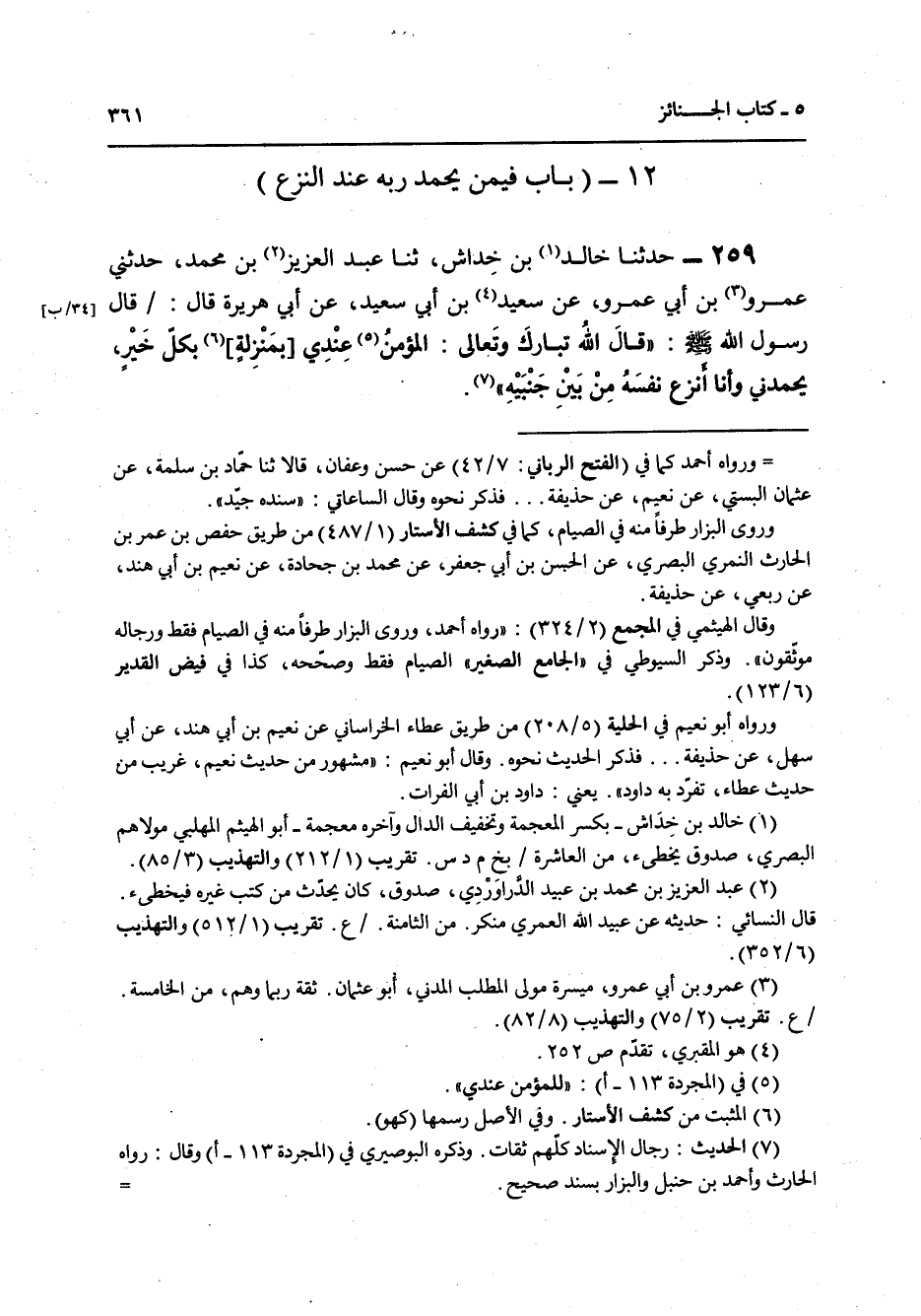 259 - حَدَّثَنَا خَالِدُ بْنُ خِدَاشٍ، ثنا عَبْدُ الْعَزِيزِ بْنُ مُحَمَّدٍ، حَدَّثَنِي عَمْرُو بْنُ أَبِي عَمْرٍو، عَنْ سَعِيدِ بْنِ أَبِي سَعِيدٍ، عَنْ أَبِي هُرَيْرَةَ قَالَ: قَالَ رَسُولُ اللَّهِ صَلَّى اللهُ عَلَيْهِ وَسَلَّمَ: " قَالَ اللَّهُ تَبَارَكَ وَتَعَالَى: «§الْمُؤْمِنُ عِنْدِي بِمَنْزِلَةٍ بِكُلِّ خَيْرٍ يَحْمَدُنِي وَأَنَا أَنْزِعُ نَفْسَهُ مِنْ بَيْنَ جَنْبَيْهِ»