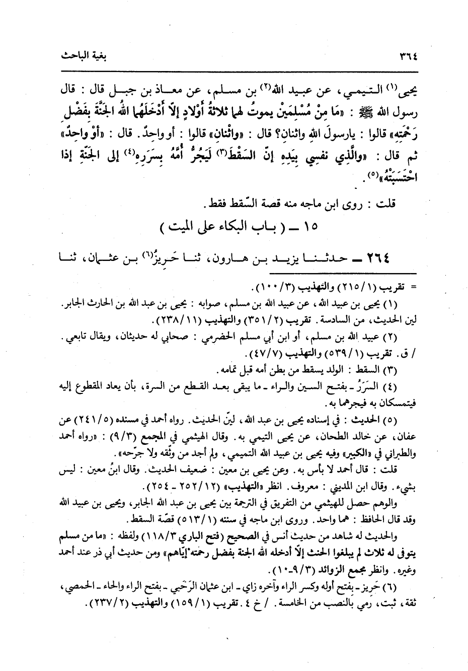 264 - حَدَّثَنَا يَزِيدُ بْنُ هَارُونَ، ثنا حَرِيزُ بْنُ عُثْمَانَ، ثنا حَبِيبُ بْنُ عُبَيْدٍ الرَّحَبِيُّ، عَنِ الْمِقْدَامِ بْنِ مَعْدِي كَرِبَ قَالَ: لَمَّا أُصِيبَ عُمَرُ دَخَلَتْ عَلَيْهِ حَفْصَةُ فَقَالَتْ يَا صَاحِبَ رَسُولِ اللَّهِ صَلَّى اللهُ عَلَيْهِ وَسَلَّمَ يَا صِهْرَ رَسُولِ اللَّهِ صَلَّى اللهُ عَلَيْهِ وَسَلَّمَ يَا أَمِيرَ الْمُؤْمِنِينَ , فَقَالَ عُمَرُ لِعَبْدِ اللَّهِ " §أَجْلِسْنِي فَلَا صَبْرَ لِي عَلَى مَا أَسْمَعُ فَأَسْنَدَهُ إِلَى صَدْرِهِ فَقَالَ: إِنِّي أُحَرِّجُ عَلَيْكِ بِمَا لِي عَلَيْكِ مِنَ الْحَقِّ أَنْ تَنْدُبِينِي بَعْدَ مَجْلِسِكِ هَذَا فَأَمَا عَيْنُكِ فَلَنْ أَمْلِكَهَا , إِنَّهُ لَيْسَ مِنْ مَيِّتِ يُنْدَبُ بِمَا لَيْسَ فِيهِ إِلَّا الْمَلَكُ يَمْقُتُهُ "