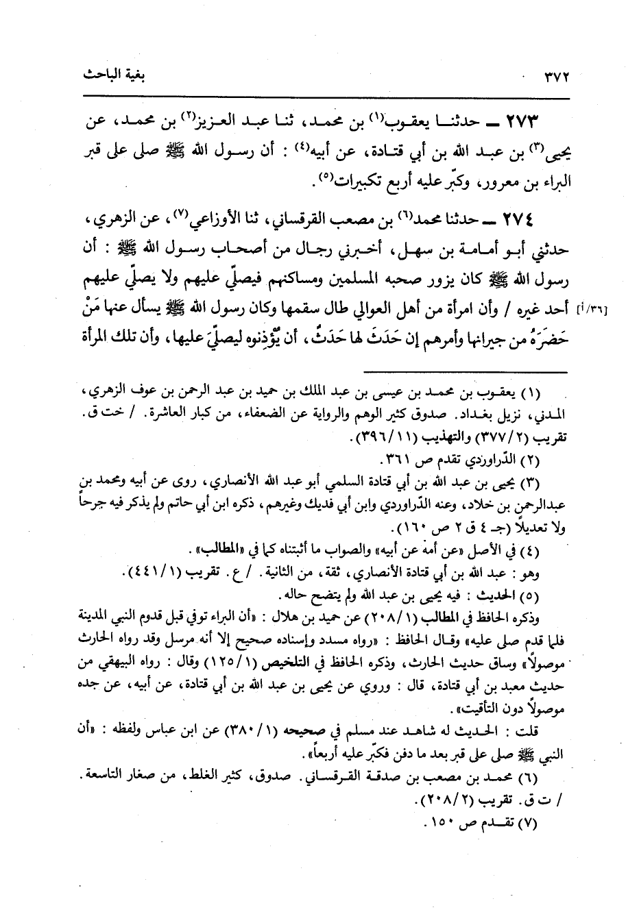 273 - حَدَّثَنَا يَعْقُوبُ بْنُ مُحَمَّدٍ، ثنا عَبْدُ الْعَزِيزِ بْنُ مُحَمَّدٍ، عَنْ يَحْيَى بْنِ عَبْدِ اللَّهِ بْنِ أَبِي قَتَادَةَ، عَنْ أَبِيهِ، أَنَّ رَسُولَ اللَّهِ صَلَّى اللهُ عَلَيْهِ وَسَلَّمَ «§صَلَّى عَلَى قَبْرِ الْبَرَاءِ بْنِ مَعْرُورٍ وَكَبَّرَ عَلَيْهِ أَرْبَعَ تَكْبِيرَاتٍ»