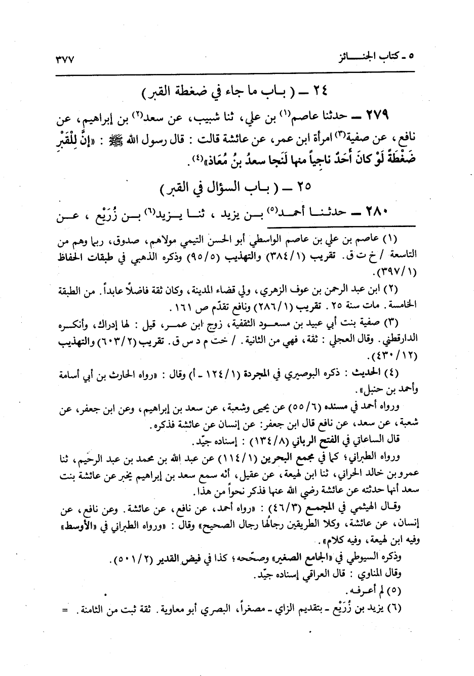 279 - حَدَّثَنَا عَاصِمُ بْنُ عَلِيٍّ، ثنا شَبِيبٌ، عَنْ سَعْدِ بْنِ إِبْرَاهِيمَ، عَنْ نَافِعٍ، عَنْ صَفِيَّةَ امْرَأَةِ ابْنِ عُمَرَ , عَنْ عَائِشَةَ قَالَتْ: قَالَ رَسُولُ اللَّهِ صَلَّى اللهُ عَلَيْهِ وَسَلَّمَ: إِنَّ «§لِلْقَبْرِ ضَغْطَةً لَوْ كَانَ أَحَدٌ نَاجِيًا مِنْهَا لَنَجَا سَعْدُ بْنُ مُعَاذٍ»