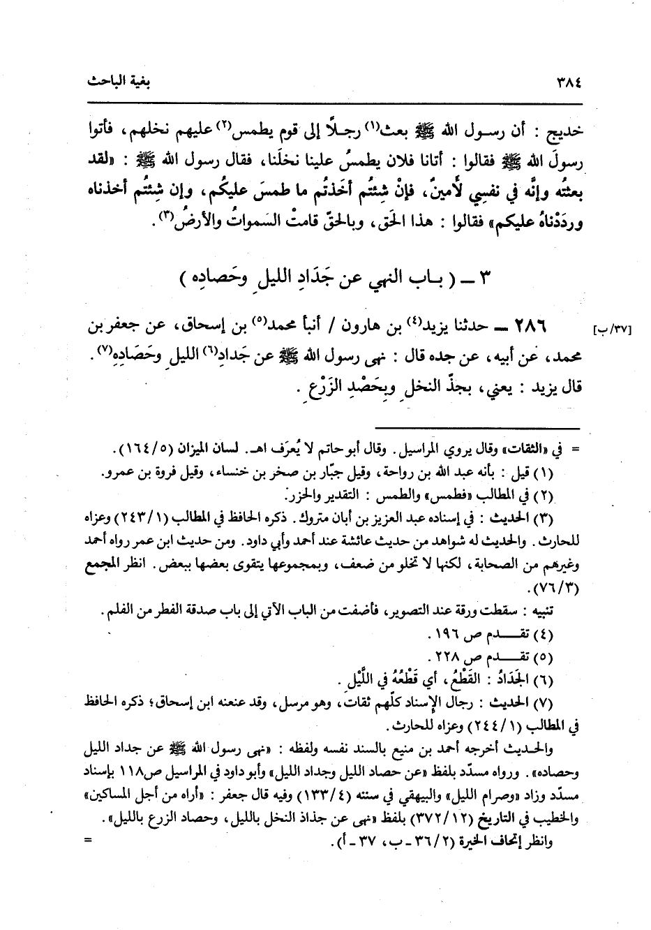 286 - حَدَّثَنَا يَزِيدُ بْنُ هَارُونَ، أَنْبَأَ مُحَمَّدُ بْنُ إِسْحَاقَ، عَنْ جَعْفَرِ بْنِ مُحَمَّدٍ، عَنْ أَبِيهِ، عَنْ جَدِّهِ قَالَ: «§نَهَى رَسُولُ اللَّهِ صَلَّى اللهُ عَلَيْهِ وَسَلَّمَ عَنْ جَدَادِ اللَّيْلِ وَحَصَادِهِ» قَالَ يَزِيدُ: يَعْنِي بِجَذِّ النَّخْلِ وَبِحَصْدِ الزَّرْعِ