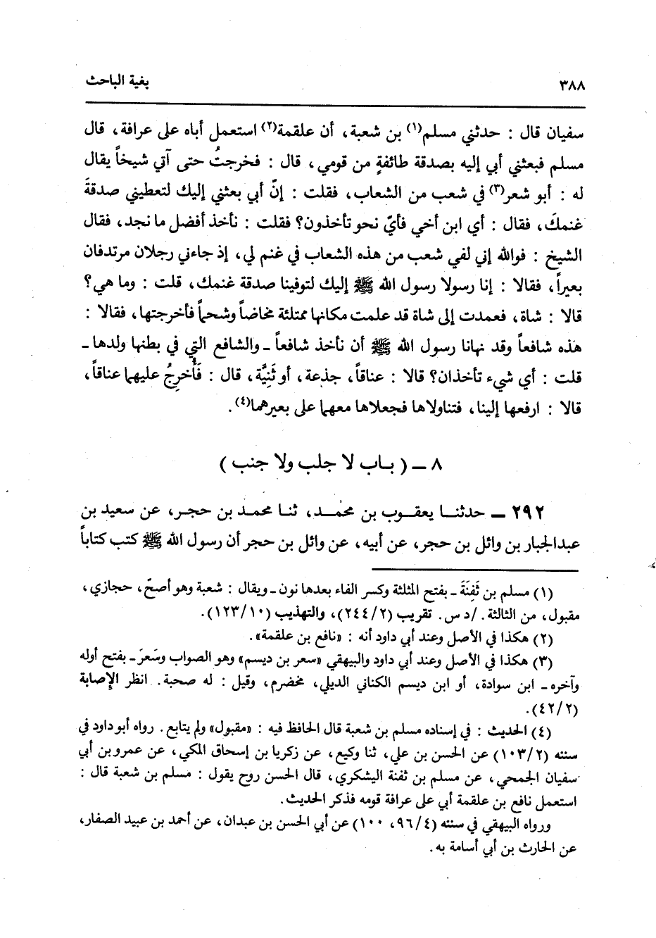 292 - حَدَّثَنَا يَعْقُوبُ بْنُ مُحَمَّدٍ، ثنا مُحَمَّدُ بْنُ حُجْرٍ، عَنْ سَعِيدِ بْنِ عَبْدِ الْجَبَّارِ بْنِ وَائِلِ بْنِ حُجْرٍ، عَنْ أَبِيهِ، عَنْ وَائِلِ بْنِ حُجْرٍ أَنَّ رَسُولَ اللَّهِ صَلَّى اللهُ عَلَيْهِ وَسَلَّمَ كَتَبَ كِتَابًا فِيهِ: «§لَا جَلَبَ وَلَا جَنَبَ وَلَا وِرَاطَ وَلَا شِغَارَ فِي الْإِسْلَامِ وَكُلُّ مُسْكِرٍ حَرَامٌ وَمَنْ أَجْبَى فَقَدْ أَرْبَا»