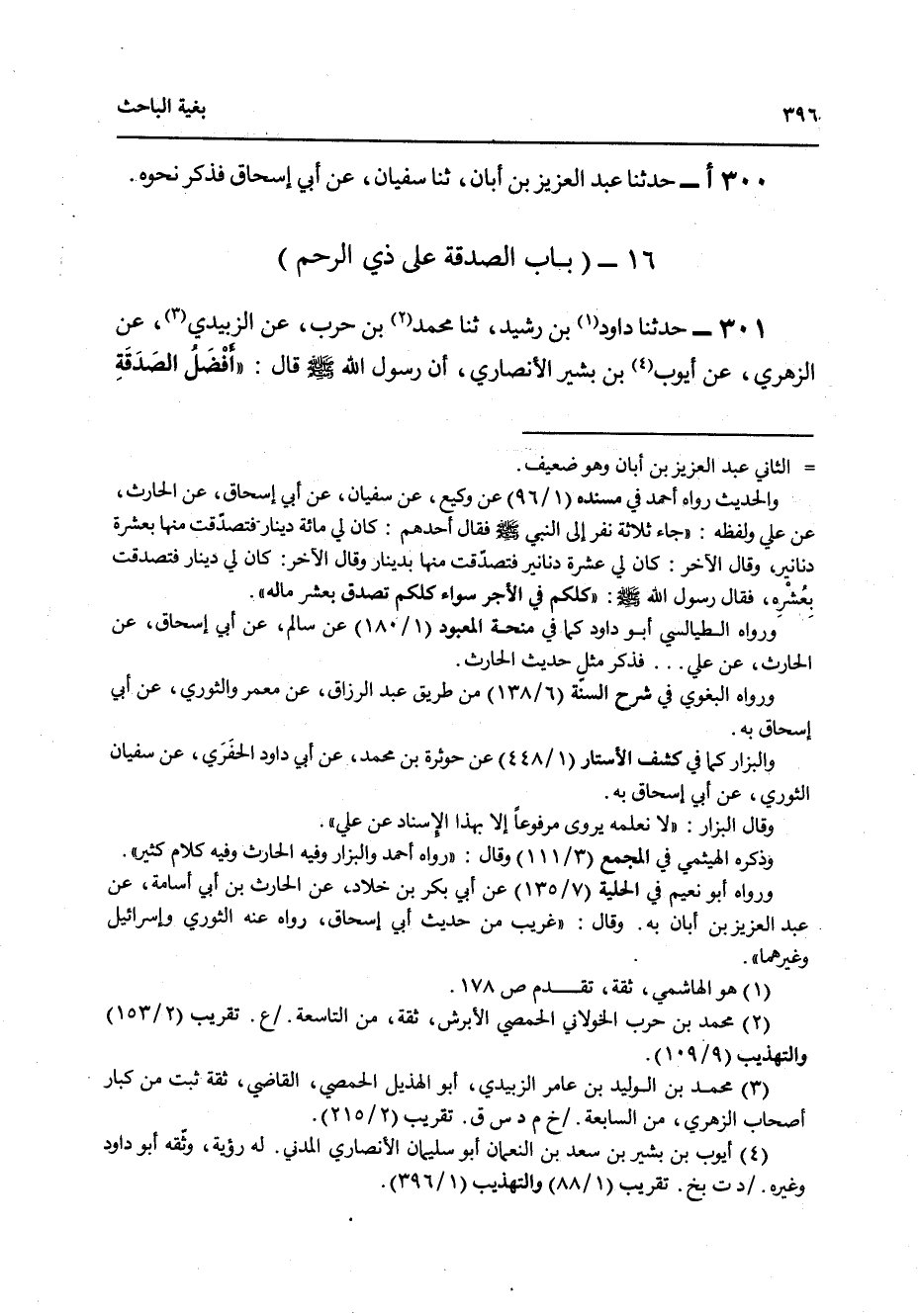 301 - حَدَّثَنَا دَاوُدُ بْنُ رُشَيْدٍ، ثنا مُحَمَّدُ بْنُ حَرْبٍ، عَنِ الزُّبَيْدِيِّ، عَنِ الزُّهْرِيِّ، عَنْ أَيُّوبَ بْنِ بَشِيرٍ الْأَنْصَارِيِّ أَنَّ رَسُولَ اللَّهِ صَلَّى اللهُ عَلَيْهِ وَسَلَّمَ قَالَ: «§أَفْضَلُ الصَّدَقَةِ صَدَقَةُ الرَّجُلِ عَلَى ذِي الرَّحِمِ الْكَاشِحِ»