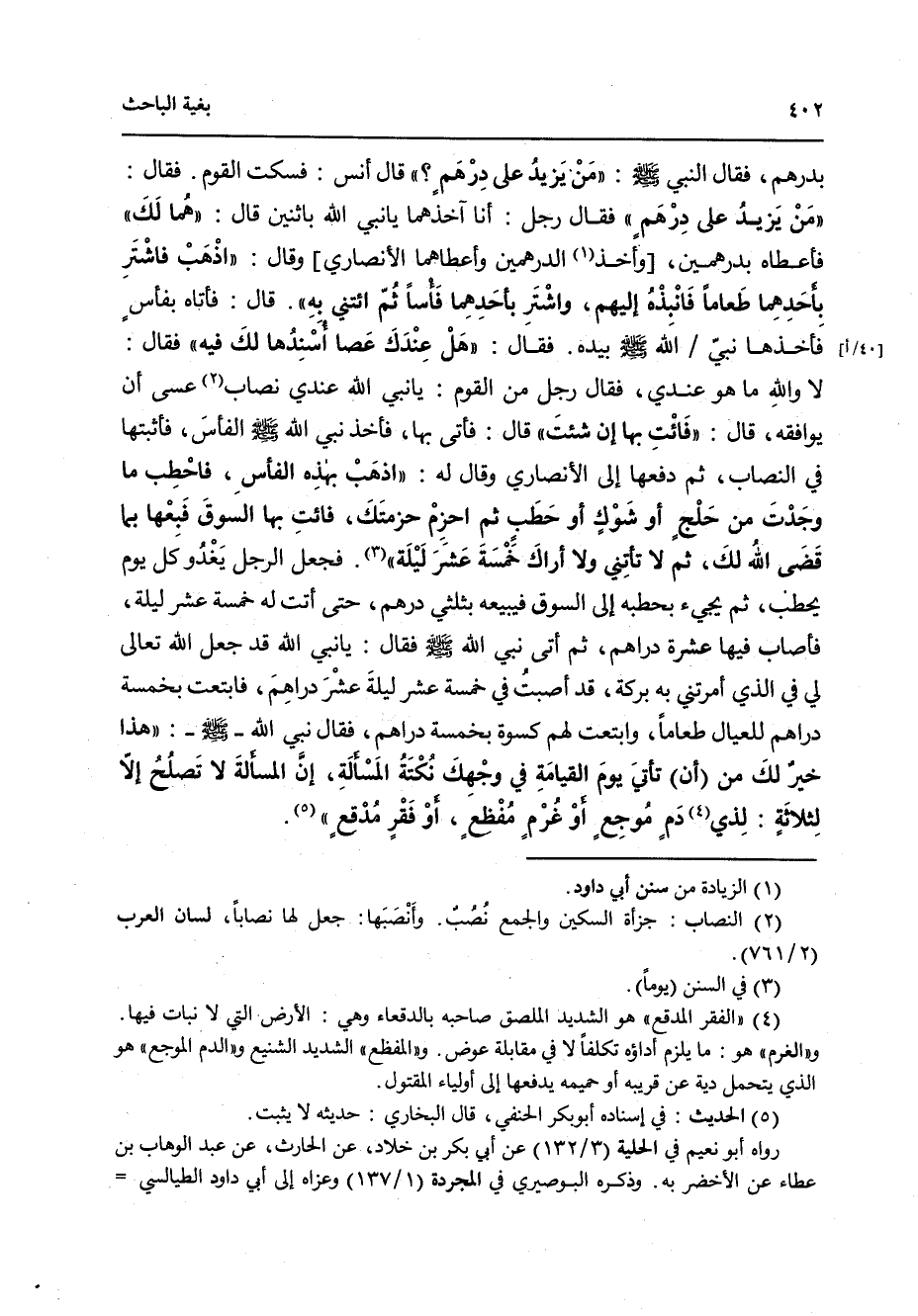 فَقَالَ النَّبِيُّ صَلى الله عَلَيه وَسَلمَ: مَنْ يَزِيدُ عَلَى دِرْهَمٍ؟ قَالَ أَنَسٌ: فَسَكَتَ الْقَوْمُ, فَقَالَ: مَنْ يَزِيدُ عَلَى دِرْهَمٍ؟ فَقَالَ رَجُلٌ: أَنَا آخُذُهُمَا يَا نَبِيَّ الله بِاثْنَيْنِ، قَالَ: هُمَا لَكَ, فَأَعْطَاهُ بِدِرْهَمَيْنِ، [وَأَخَذَ الدِّرْهَمَيْنِ وَأَعْطَاهُمَا الأَنْصَارِيَّ], وَقَالَ: اذْهَبْ فَاشْتَرِ بِأَحَدِهِمَا طَعَامًا, فَانْبِذْهُ إِلَيْهِمْ، وَاشْتَرِ بِأَحَدِهِمَا فَأْسًا ثُمَّ ائْتِنِي بِهِ, قَالَ: فَأَتَاهُ بِفَأْسٍ, فَأَخَذَهَا نَبِيُّ الله صَلى الله عَلَيه وَسَلمَ بِيَدِهِ, فَقَالَ: هَلْ عِنْدَكَ عَصًا أَسْنِدُهَا لَكَ فِيهِ؟ فَقَالَ: لاَ وَالله مَا هُوَ عِنْدِي, فَقَالَ رَجُلٌ مِنَ الْقَوْمِ: يَا نَبِيَّ الله, عِنْدِي نِصَابٌ عَسَى أَنْ يُوَافِقَهُ، قَالَ: فَائْتِ بِهَا إِنْ شِئْتَ, قَالَ: فَأَتَى بِهَا، فَأَخَذَ نَبِيُّ الله صَلى الله عَلَيه وَسَلمَ الْفَأْسَ, فَأَثْبَتَهَا فِي النِّصَابِ, ثُمَّ دَفَعَهَا إِلَى الأَنْصَارِيِّ, وَقَالَ لَهُ: اذْهَبْ بِهَذِهِ الْفَأْسِ فَاحْطِبْ مَا وَجَدْتَ مِنْ حَلْجٍ, أَوْ شَوْكٍ, أَوْ حَطَبٍ، ثُمَّ احْزِمْ حِزْمَتَكَ فَائْتِ بِهَا السُّوقَ, فَبِعْهَا بِمَا قَضَى الله لَكَ، ثُمَّ لاَ تَأْتِنِي وَلاَ أَرَاكَ خَمْسَةَ عَشَرَ لَيْلَةً، فَجَعَلَ الرَّجُلُ يَغْدُو كُلَّ يَوْمٍ يَحْطِبُ, ثُمَّ يَجِيءُ بِحَطَبِهِ إِلَى السُّوقِ, فَيَبِيعُهُ بِثُلُثَيْ دِرْهَمٍ, حَتَّى أَتَتْ لَهُ خَمْسَةَ عَشَرَ لَيْلَةً, فَأَصَابَ فِيهَا عَشْرَةَ دَرَاهِمَ, ثُمَّ أَتَى نَبِيَّ الله صَلى الله عَلَيه وَسَلمَ, فَقَالَ: يَا نَبِيَّ الله، قَدْ جَعَلَ الله تَعَالَى لِي فِي الَّذِي أَمَرْتَنِي بِهِ بَرَكَةً، قَدْ أَصَبْتُ فِي خَمْسَةَ عَشَرَ لَيْلَةً, عَشْرَ دَرَاهِمَ، فَابْتَعْتُ بِخَمْسَةِ دَرَاهِمَ لِلْعِيَالِ طَعَامًا، وَابْتَعْتُ لَهُمْ كِسْوَةً بِخَمْسَةِ دَرَاهِمَ، فَقَالَ نَبِيُّ الله صَلى الله عَلَيه وَسَلمَ: هَذَا خَيْرٌ لَكَ مِنْ أَنِّ تَأْتِيَ يَوْمَ الْقِيَامَةِ فِي وَجْهِكَ نُكْتَةُ الْمَسْأَلَةِ، إِنَّ الْمَسْأَلَةَ لاَ تَصْلُحُ إِلاَّ لِثَلاَثَةٍ: لِذِي دَمٍ مُوجِعٍ، أَوْ غُرْمٍ مُفْظِعٍ، أَوْ فَقْرٍ مُدْقِعٍ.