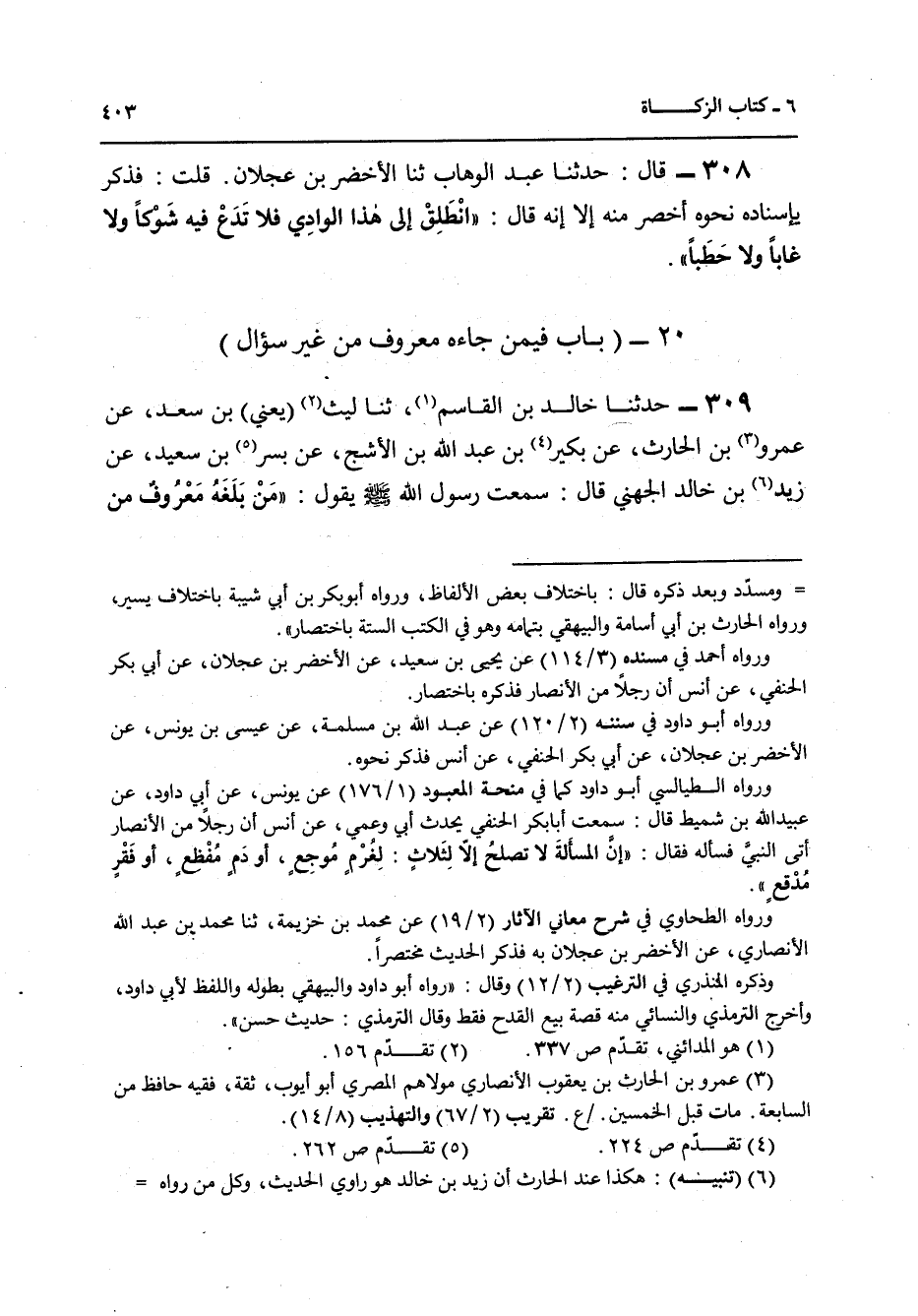 309 - حَدَّثَنَا خَالِدُ بْنُ الْقَاسِمِ، ثنا لَيْثٌ يَعْنِي ابْنَ سَعْدٍ، عَنْ عَمْرِو بْنِ الْحَارِثِ، عَنْ بُكَيْرِ بْنِ عَبْدِ اللَّهِ بْنِ الْأَشَجِّ، عَنْ بُسْرِ بْنِ سَعِيدٍ، عَنْ زَيْدِ بْنِ خَالِدٍ الْجُهَنِيِّ قَالَ: سَمِعْتُ رَسُولَ اللَّهِ صَلَّى اللهُ عَلَيْهِ وَسَلَّمَ يَقُولُ: «§مَنْ بَلَغَهُ مَعْرُوفٌ مِنْ أَخِيهِ مِنْ غَيْرِ مَسْأَلَةٍ وَلَا إِشْرَافِ نَفْسٍ فَلْيَقْبَلْهُ وَلَا يَرُدَّهُ فَإِنَّمَا هُوَ رِزْقٌ سَاقَهُ اللَّهُ إِلَيْهِ»