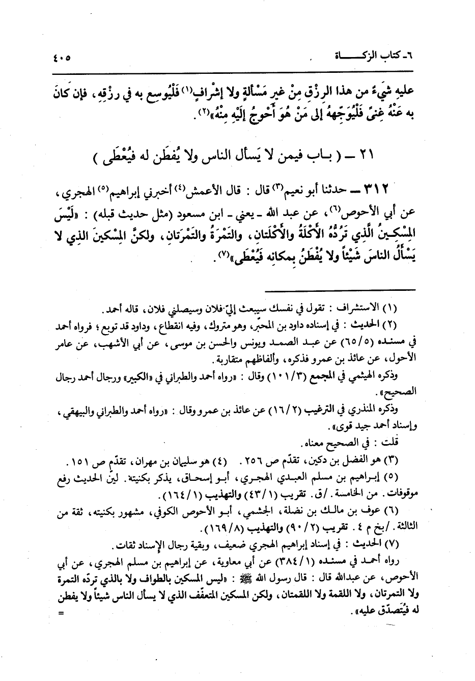 312 - حَدَّثَنَا أَبُو نُعَيْمٍ قَالَ: قَالَ الْأَعْمَشُ، أَخْبَرَنِي إِبْرَاهِيمُ الْهَجَرِيُّ، عَنْ أَبِي الْأَحْوَصِ، عَنْ عَبْدِ اللَّهِ يَعْنِي ابْنَ مَسْعُودٍ، مِثْلَ حَدِيثٍ قَبْلَهُ: «§لَيْسَ الْمِسْكِينُ الَّذِي تَرُدُّهُ الْأُكْلَةُ وَالْأُكْلَتَانِ وَالتَّمْرَةُ وَالتَّمْرَتَانِ وَلَكِنَّ الْمِسْكِينَ الَّذِي لَا يَسْأَلُ النَّاسَ شَيْئًا وَلَا يُفْطَنُ بِمَكَانِهِ فَيُعْطَى»