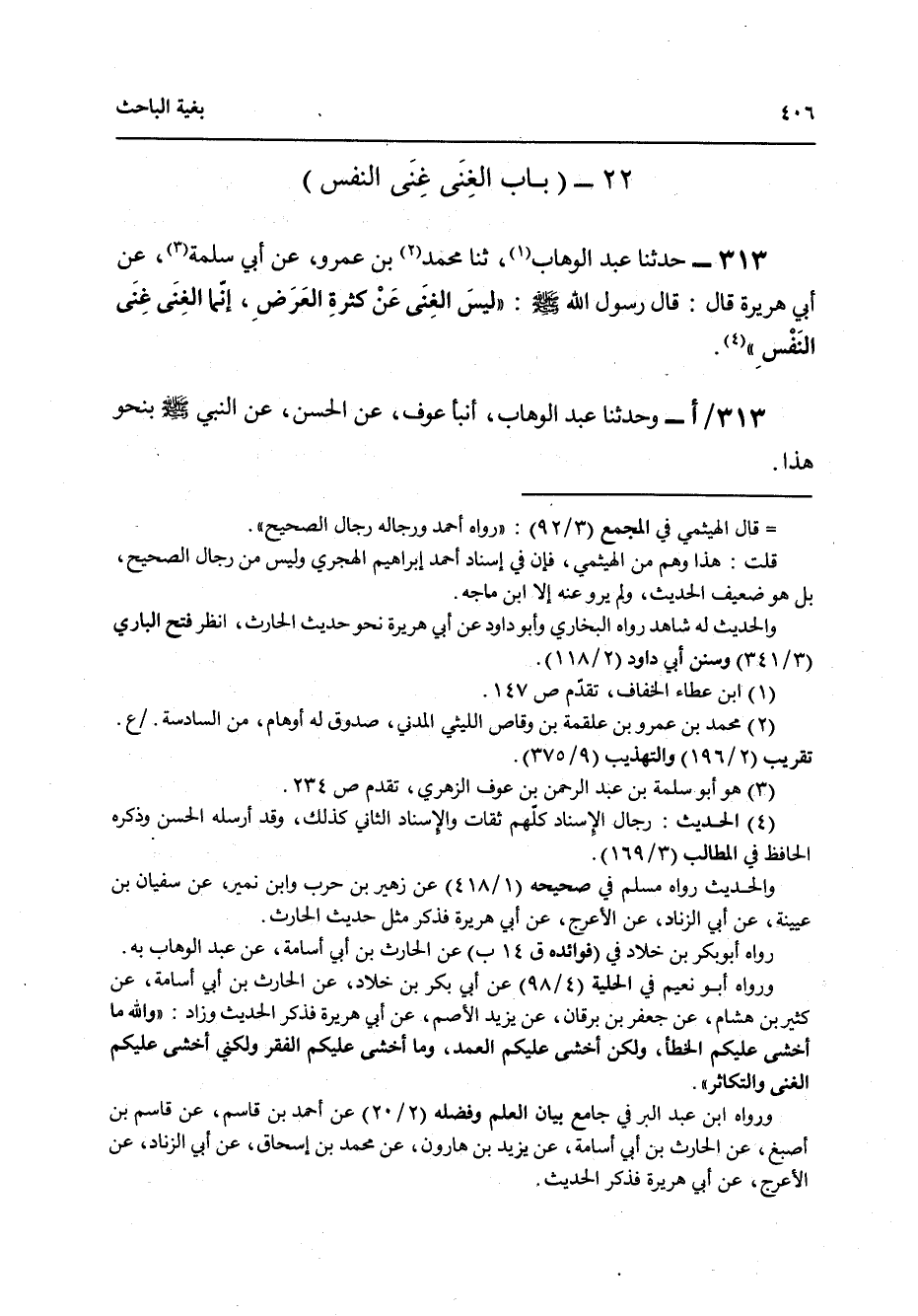 313 - حَدَّثَنَا عَبْدُ الْوَهَّابِ، ثنا مُحَمَّدُ بْنُ عَمْرٍو، عَنْ أَبِي سَلَمَةَ، عَنْ أَبِي هُرَيْرَةَ قَالَ: قَالَ رَسُولُ اللَّهِ صَلَّى اللهُ عَلَيْهِ وَسَلَّمَ: «§لَيْسَ الْغِنَى عَنْ كَثْرَةِ الْعَرَضِ إِنَّمَا الْغِنَى غِنَى النَّفْسِ» وَحَدَّثَنَا عَبْدُ الْوَهَّابِ، أَنْبَأَ عَوْفٌ، عَنِ الْحَسَنِ، عَنِ النَّبِيِّ صَلَّى اللهُ عَلَيْهِ وَسَلَّمَ بِنَحْوِ هَذَا