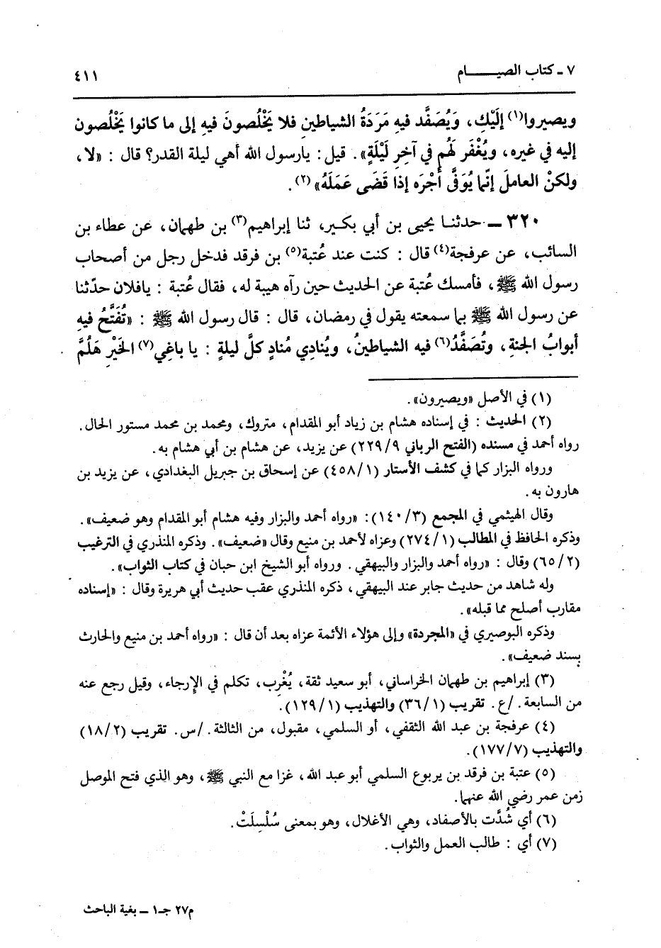 320 - حَدَّثَنَا يَحْيَى بْنُ أَبِي بُكَيْرٍ، ثنا إِبْرَاهِيمُ بْنُ طَهْمَانَ، عَنْ عَطَاءِ بْنِ السَّائِبِ، عَنْ عَرْفَجَةَ قَالَ: كُنْتُ عِنْدَ عُتْبَةَ بْنِ فَرْقَدٍ فَدَخَلَ رَجُلٌ مِنْ أَصْحَابِ رَسُولِ اللَّهِ صَلَّى اللهُ عَلَيْهِ وَسَلَّمَ فَأَمْسَكَ عُتْبَةُ عَنِ الْحَدِيثِ حِينَ رَآهُ هَيْبَةً لَهُ فَقَالَ عُتْبَةُ: يَا فُلَانُ حَدِّثْنَا عَنْ رَسُولِ اللَّهِ صَلَّى اللهُ عَلَيْهِ وَسَلَّمَ بِمَا سَمِعْتَهُ يَقُولُ فِي رَمَضَانَ. قَالَ: قَالَ رَسُولُ اللَّهِ صَلَّى اللهُ عَلَيْهِ وَسَلَّمَ: «§تُفْتَحُ فِيهِ أَبْوَابُ الْجَنَّةِ وَتُصَفَّدُ فِيهِ الشَّيَاطِينُ وَيُنَادِي مُنَادٍ كُلَّ لَيْلَةٍ يَا بَاغِيَ الْخَيْرِ هَلُمَّ وَيَا بَاغِيَ الشَّرِّ أَقْصِرْ»