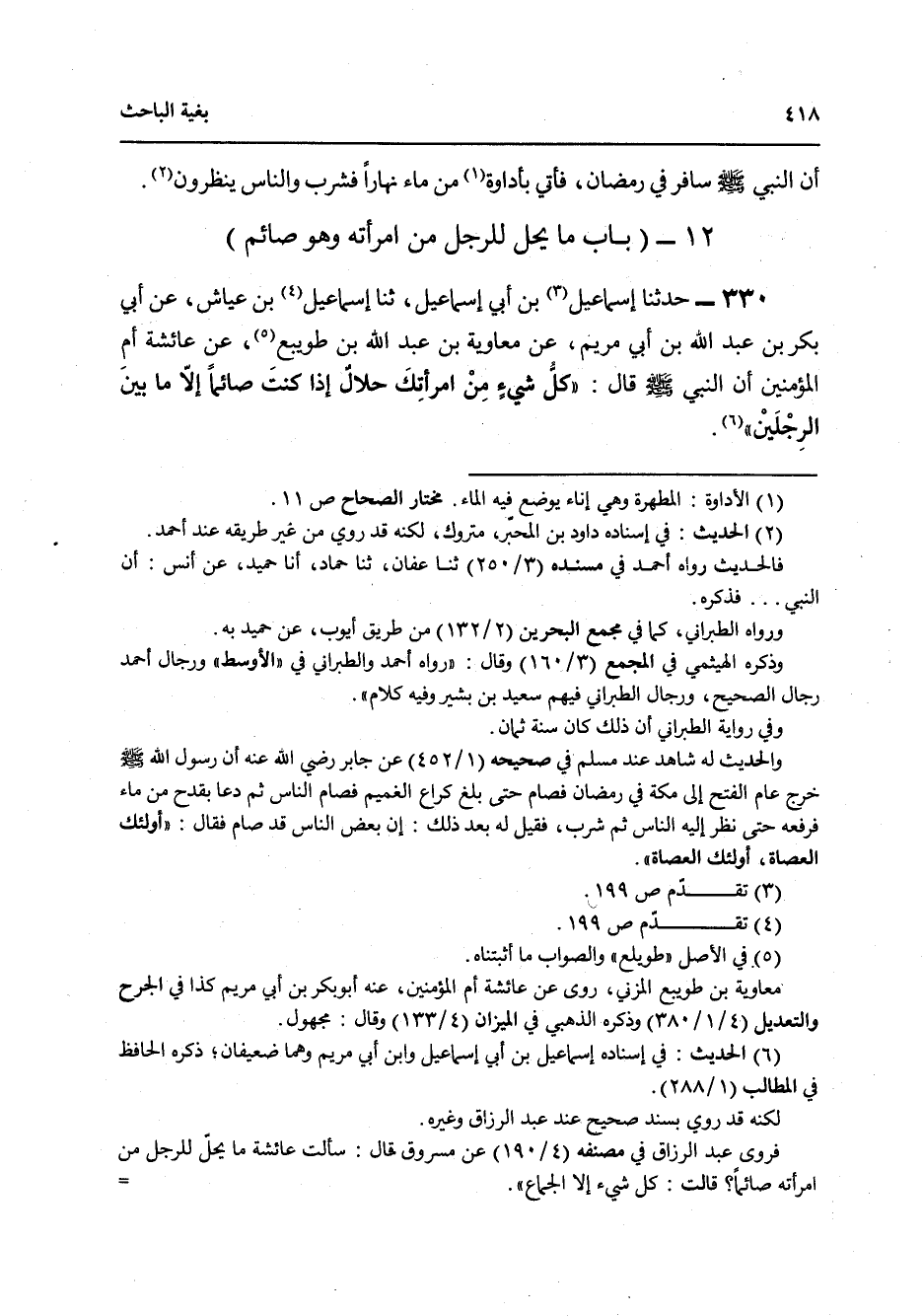 330 - حَدَّثَنَا إِسْمَاعِيلُ بْنُ أَبِي إِسْمَاعِيلَ، ثنا إِسْمَاعِيلُ بْنُ عَيَّاشٍ، عَنْ أَبِي بَكْرِ بْنِ عَبْدِ اللَّهِ بْنِ أَبِي مَرْيَمَ، عَنْ مُعَاوِيَةَ بْنِ عَبْدِ اللَّهِ بْنِ طُوَيْبِعٍ، عَنْ عَائِشَةَ أُمِّ الْمُؤْمِنِينَ أَنَّ النَّبِيَّ صَلَّى اللهُ عَلَيْهِ وَسَلَّمَ قَالَ: «§كُلُّ شَيْءٍ مِنَ امْرَأَتِكَ حَلَالٌ إِذَا كُنْتَ صَائِمًا إِلَّا مَا بَيْنَ الرِّجْلَيْنِ»