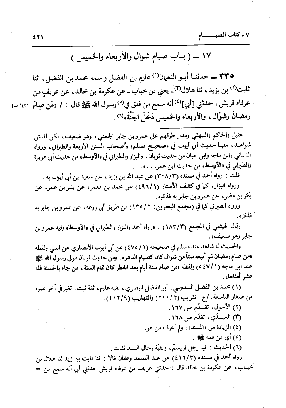 335 - حَدَّثَنَا أَبُو النُّعْمَانِ عَارِمُ بْنُ الْفَضْلِ وَاسْمُهُ مُحَمَّدُ بْنُ الْفَضْلِ , ثنا ثَابِتُ بْنُ يَزِيدَ، ثنا هِلَالٌ يَعْنِي ابْنَ خَبَّابٍ، عَنْ عِكْرِمَةَ بْنِ خَالِدٍ، عَنْ عَرِيفٍ مِنْ عُرَفَاءِ قُرَيْشٍ حَدَّثَنِي أَبِي، أَنَّهُ سَمِعَ مِنْ فِلْقِ فِي رَسُولِ اللَّهِ صَلَّى اللهُ عَلَيْهِ وَسَلَّمَ قَالَ: «§مَنْ صَامَ رَمَضَانَ وَشَوَّالَ وَالْأَرْبِعَاءَ وَالْخَمِيسَ دَخَلَ الْجَنَّةَ»