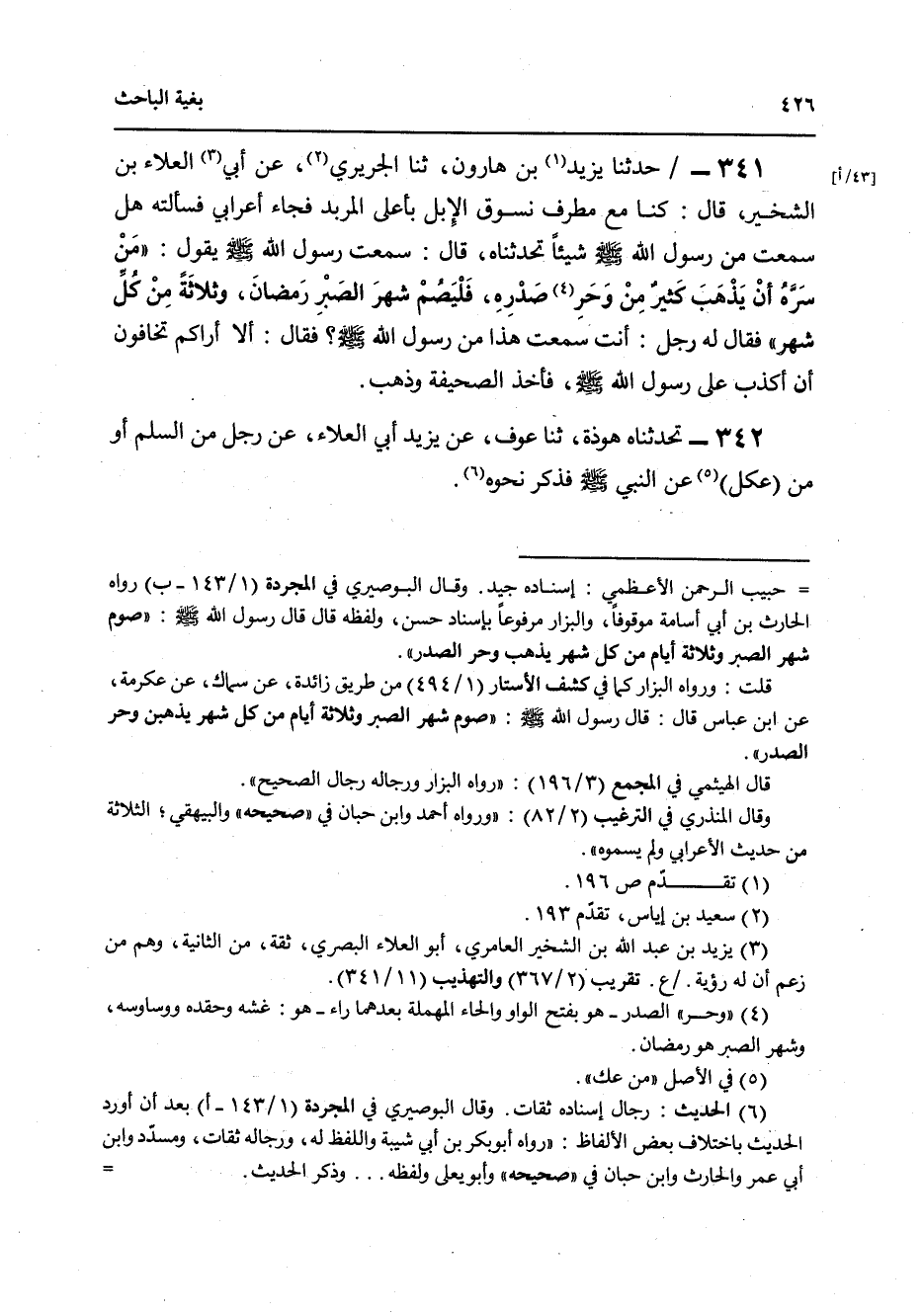 341 - حَدَّثَنَا يَزِيدُ بْنُ هَارُونَ، ثَنَا الْجُرَيْرِيُّ، عَنْ أَبِي الْعَلَاءِ بْنِ الشِّخِّيرِ قَالَ: كُنَّا مَعَ مُطَرِّفٍ نَسُوقُ الْإِبِلَ بِأَعْلَى الْمِرْبَدِ فَجَاءَ أَعْرَابِيٌّ فَسَأَلْتُهُ: هَلْ سَمِعْتَ مِنَ رَسُولِ اللَّهِ صَلَّى اللهُ عَلَيْهِ وَسَلَّمَ شَيْئًا تُحَدِّثُنَاهُ؟ قَالَ: سَمِعْتُ رَسُولَ اللَّهِ صَلَّى اللهُ عَلَيْهِ وَسَلَّمَ يَقُولُ: «§مَنْ سَرَّهُ أَنْ يَذْهَبَ كَثِيرٌ مِنْ وَحَرِ صَدْرِهِ فَلْيَصُمْ شَهْرَ الصَّبْرِ رَمَضَانَ وَثَلَاثَةً مِنْ كُلِّ شَهْرٍ» فَقَالَ لَهُ رَجُلٌ: أَنْتَ سَمِعْتَ هَذَا مِنْ رَسُولِ اللَّهِ صَلَّى اللهُ عَلَيْهِ وَسَلَّمَ؟ فَقَالَ: أَلَا أَرَاكُمْ تَخَافُونَ أَنْ أَكْذِبَ عَلَى رَسُولِ اللَّهِ صَلَّى اللهُ عَلَيْهِ وَسَلَّمَ , فَأَخَذَ الصَّحِيفَةَ وَذَهَبَ.