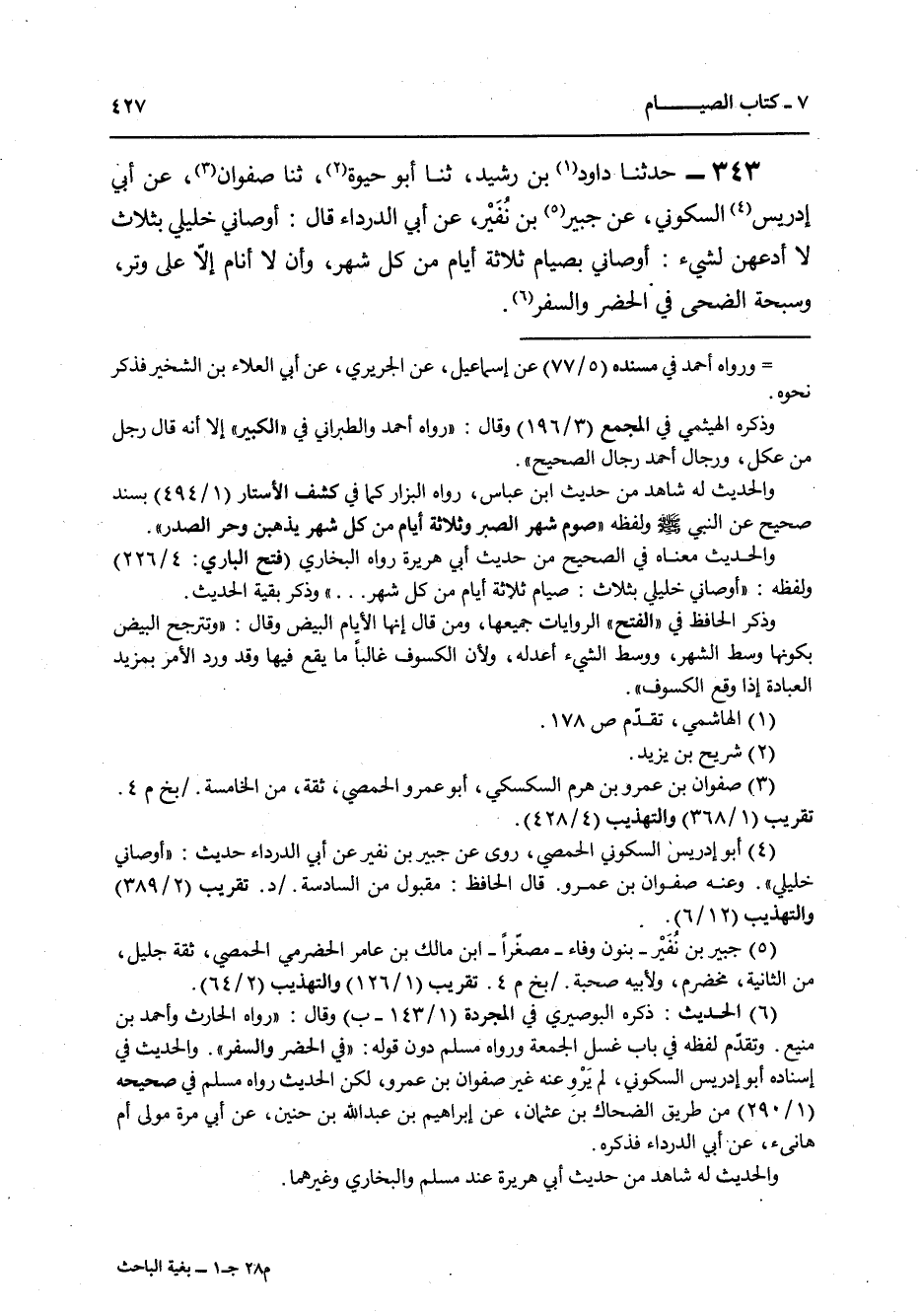 343 - حَدَّثَنَا دَاوُدُ بْنُ رُشَيْدٍ، ثنا أَبُو حَيْوَةَ، ثنا صَفْوَانُ، عَنْ أَبِي إِدْرِيسَ السَّكُونِيِّ، عَنْ جُبَيْرِ بْنِ نُفَيْرٍ، عَنْ أَبِي الدَّرْدَاءِ قَالَ: أَوْصَانِي خَلِيلِي بِثَلَاثٍ لَا أَدَعُهُنَّ لِشَيْءٍ: «§أَوْصَانِي بِصِيَامِ ثَلَاثَةِ أَيَّامٍ مِنْ كُلِّ شَهْرٍ وَأَنْ لَا أَنَامَ إِلَّا عَلَى وِتْرٍ وَسُبْحَةِ الضُّحَى فِي الْحَضَرِ وَالسَّفَرِ»