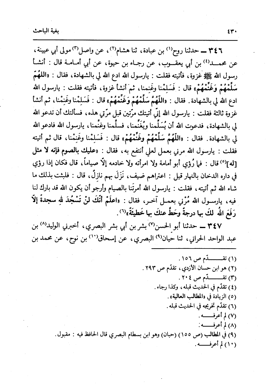 346 - حَدَّثَنَا رَوْحُ بْنُ عُبَادَةَ، ثنا هِشَامٌ، عَنْ وَاصِلٍ مَوْلَى أَبِي عُيَيْنَةَ، عَنْ مُحَمَّدِ بْنِ أَبِي يَعْقُوبَ، عَنْ رَجَاءِ بْنِ حَيْوَةَ، عَنْ أَبِي أُمَامَةَ قَالَ: أَنْشَأَ رَسُولُ اللَّهِ صَلَّى اللهُ عَلَيْهِ وَسَلَّمَ غَزْوَةً فَأَتَيْتُهُ فَقُلْتُ: يَا رَسُولَ اللَّهِ ادْعُ اللَّهَ لِي بِالشَّهَادَةِ فَقَالَ: «اللَّهُمَّ سَلِّمْهُمْ، وَغَنِّمْهُمْ» قَالَ: فَسَلِمْنَا وَغَنِمْنَا , ثُمَّ أَنْشَأَ غَزْوَةً فَأَتَيْتُهُ فَقُلْتُ: يَا رَسُولَ اللَّهِ ادْعُ اللَّهَ لِي بِالشَّهَادَةِ فَقَالَ: «اللَّهُمَّ سَلِّمْهُمْ، وَغَنِّمْهُمْ» قَالَ: فَسَلِمْنَا، وَغَنِمْنَا , ثُمَّ أَنْشَأَ غَزْوَةً ثَالِثَةً فَقُلْتُ: يَا رَسُولَ اللَّهِ إِنِّي أَتَيْتُكَ مَرَّتَيْنِ قَبْلَ مَرَّتِي هَذِهِ فَسَأَلْتُكَ أَنْ تَدْعُوَ اللَّهَ لِي بِالشَّهَادَةِ فَدَعَوْتَ اللَّهَ أَنْ يُسَلِّمَنَا، وَيُغَنِّمَنَا، فَسَلِمْنَا، وَغَنِمْنَا يَا رَسُولَ اللَّهِ فَادْعُ اللَّهَ لِي بِالشَّهَادَةِ فَقَالَ: «اللَّهُمَّ سَلِّمْهُمْ، وَغَنِّمْهُمْ» قَالَ: فَسَلِمْنَا، وَغَنِمْنَا قَالَ: ثُمَّ أَتَيْتُهُ فَقُلْتُ: يَا رَسُولَ اللَّهِ مُرْنِي بِعَمَلٍ لِعَلِيِّ أَنْتَفِعُ بِهِ فَقَالَ: «عَلَيْكَ بِالصَّوْمِ فَإِنَّهُ لَا مِثْلَ لَهُ» , قَالَ: فَمَا رُئِيَ أَبُو أُمَامَةَ وَلَا امْرَأَتُهُ وَلَا خَادِمُهُ إِلَّا صِيَامًا قَالَ: فَكَانَ إِذَا رُئِيَ فِي دَارِهِ الدُّخَانُ بِالنَّهَارِ قِيلَ اعْتَرَاهُمْ ضَيْفٌ نَزَلَ بِهِمْ نَازِلٌ قَالَ: فَلَبِثْتُ بِذَلِكَ مَا شَاءَ اللَّهُ ثُمَّ أَتَيْتُهُ فَقُلْتُ: يَا رَسُولَ اللَّهِ، أَمَرْتَنَا بِالصِّيَامِ وَأَرْجُو أَنْ يَكُونَ اللَّهُ قَدْ بَارِكَ لَنَا فِيهِ، يَا رَسُولَ اللَّهِ، مُرْنِي بِعَمَلٍ آخَرَ، فَقَالَ: «اعْلَمْ أَنَّكَ §لَنْ تَسْجُدَ لِلَّهِ سَجْدَةً إِلَّا رَفَعَ اللَّهُ لَكَ بِهَا دَرَجَةً، وَحَطَّ عَنْكَ بِهَا خَطِيئَةً»